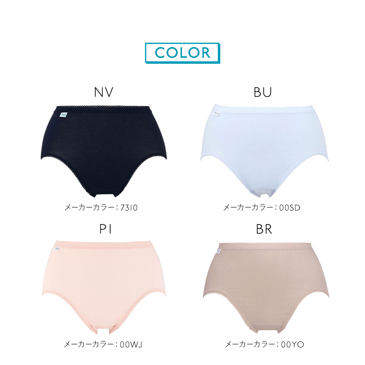 カラーNV-ネイビー、BU-ブルー、PI-ピンク、BR-ブラウン、BE-ベージュ、CR-クリーム