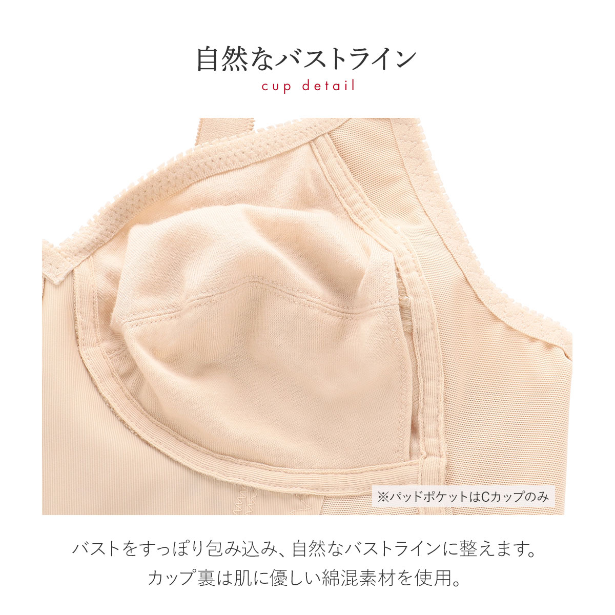 カップ裏は肌に優しい綿混素材を使用。バストをすっぽり包み込み、自然なバストラインに整えます。パッドポケット付きなので、お手持ちのパッドを使用することも可能です。クロッチはボタン式なので着脱が楽な仕様です。