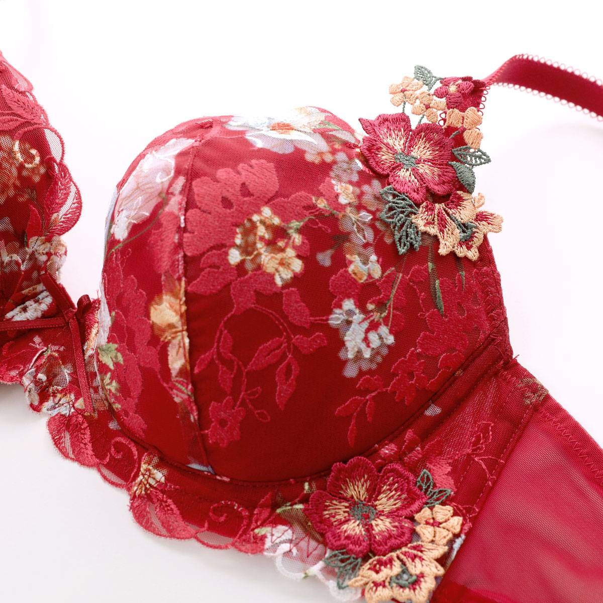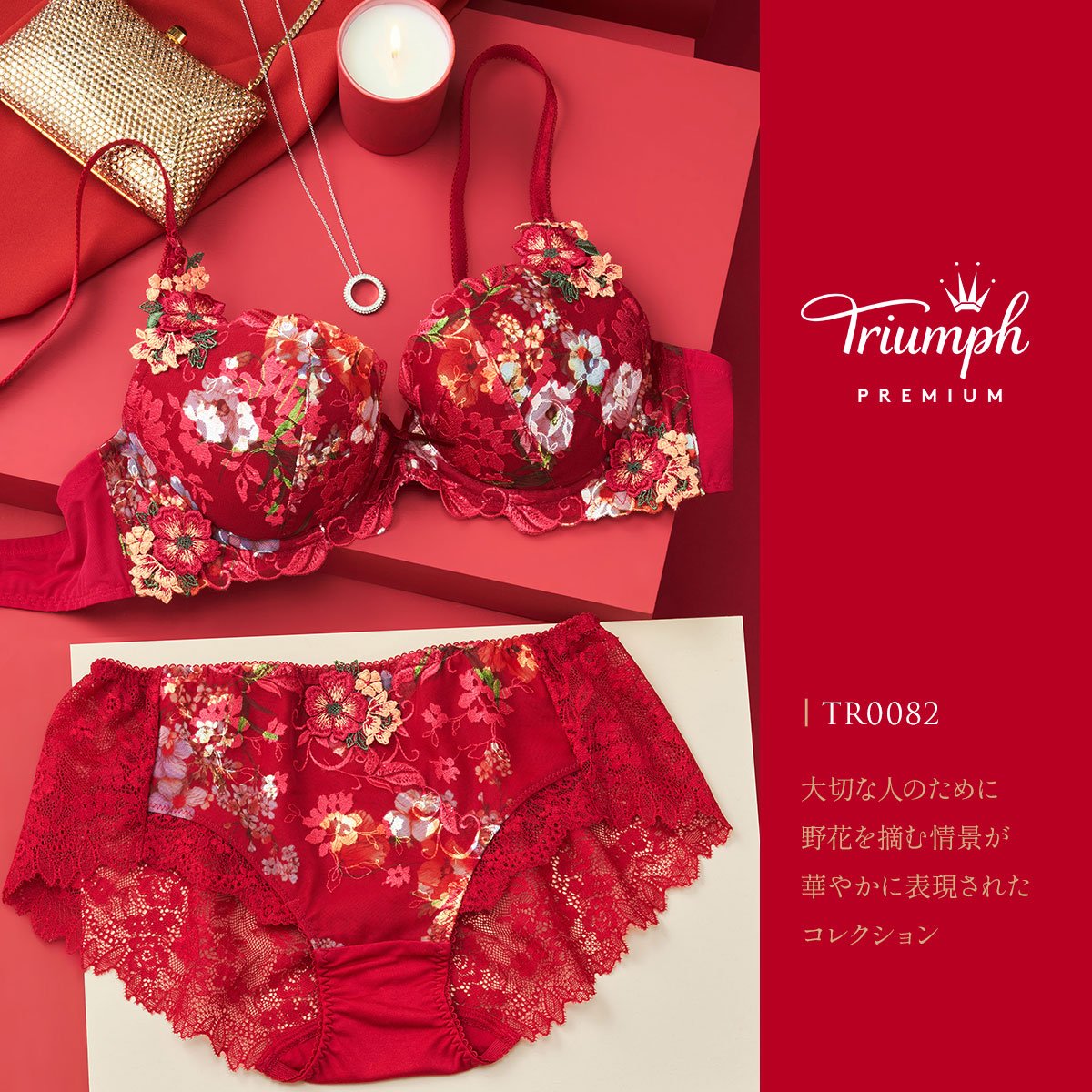 TR0082プレミアムコレクションは、デリケートなレースにモダンなプリントが施されラグジュアリーな印象です。大切な人のために野花を摘む情景が華やかなプリントとエンブロイダリーモチーフで表現されています。