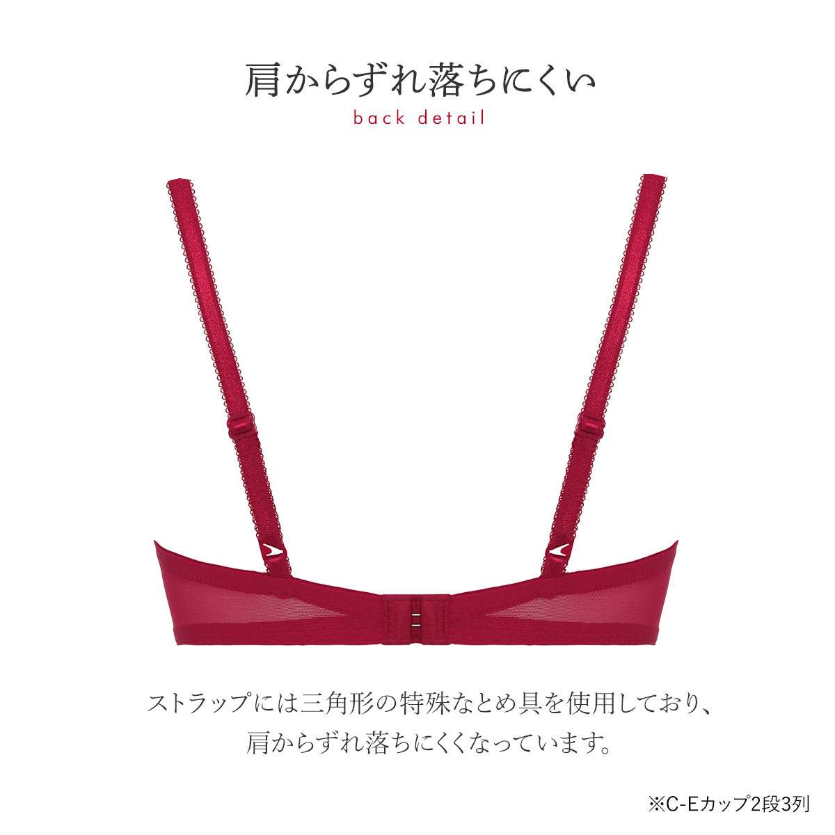 | 仕 様 | ・ホックの数:Bカップ1段3列、C-Eカップ2段3列 ・3/4カップ ・パッド取外し:可能 ・肩紐取外し:不可 ・ワイヤー入り ・サイドボーン:あり |