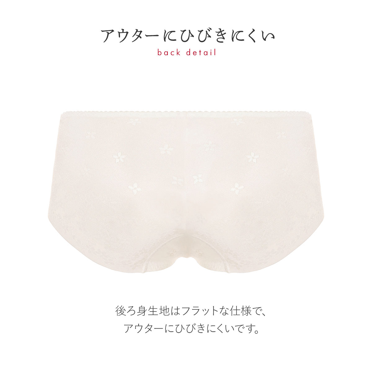 後ろ身頃はフラットな仕様で、ラインがアウターにひびきにくいです。前脚口はレース仕様なので、お肌にくいこみにくくなっています。