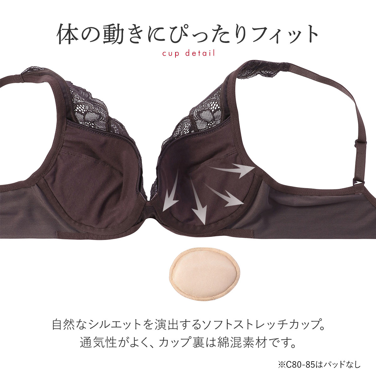 カップは体の動きにぴったりフィットし、自然なシルエットを演出する恋するブラ独特のソフトストレッチカップ。カップ下部は通気性がよいホール開き仕様、カップ裏は綿混素材です。