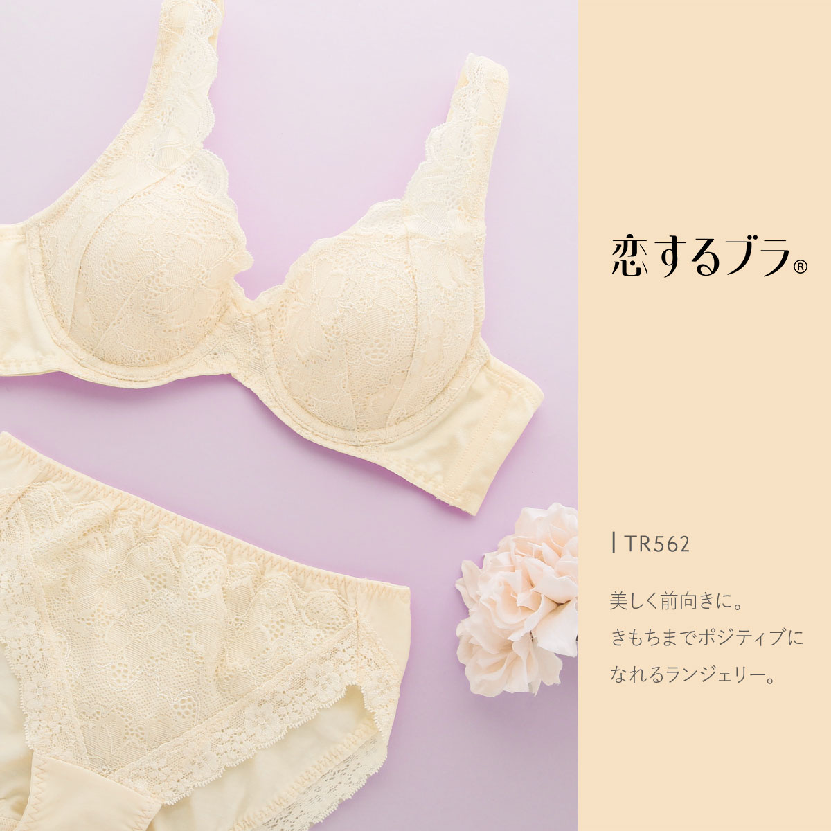 恋するブラTR562 は「ソフトな風合い」をポイントに、糸使いや伸び感、柄表現など、細部にこだわった落下版ストレッチラッセルレースを使用しています。光沢糸とマット糸を組合せて立体感を出した蘭のモチーフが、華やかながらも優しい雰囲気です。