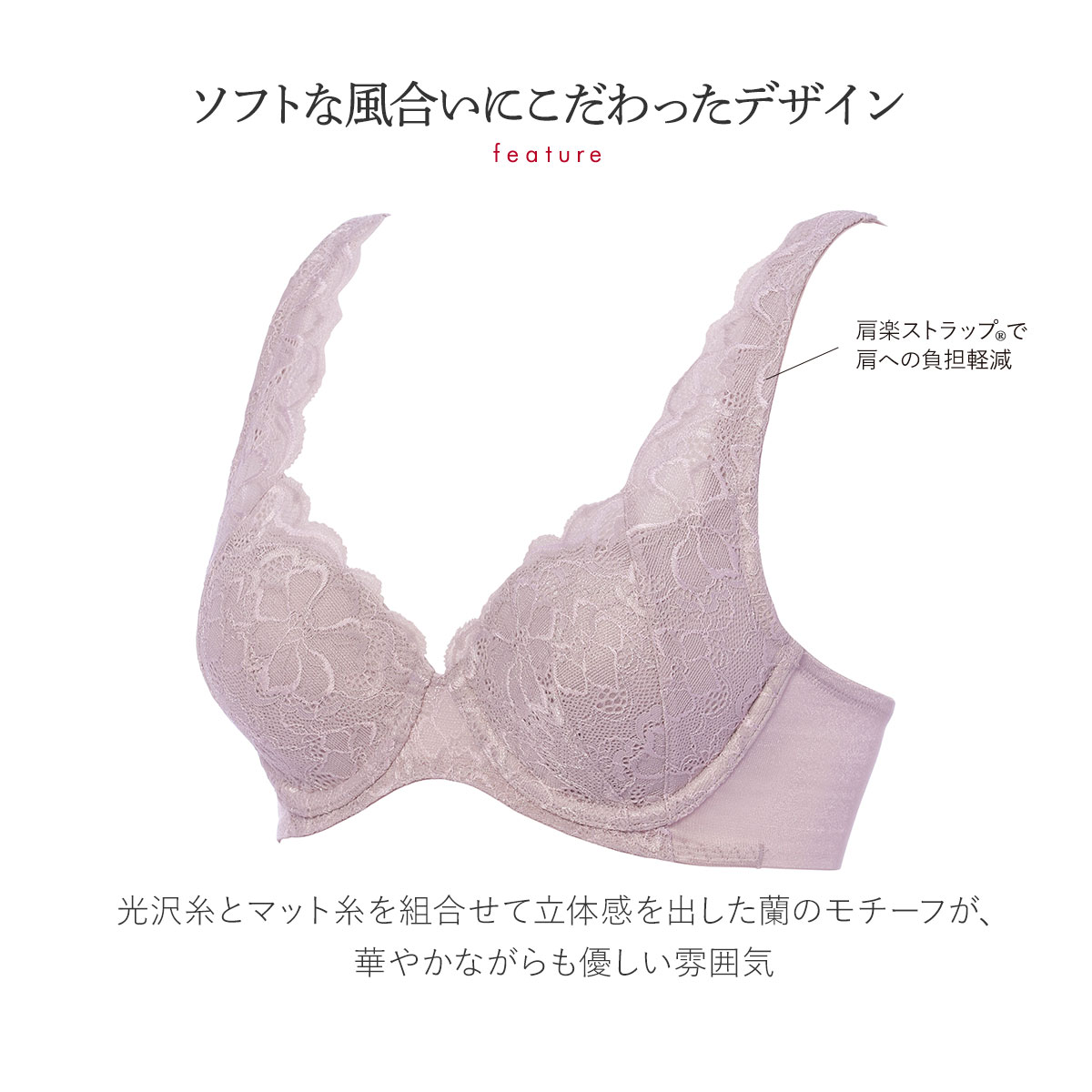 フロント中心部のワイヤーを薄くフラットにし、外側に反らせたNEWエンジェルワイヤー(R)仕様のため、肌にくいこみにくく、痛くなりにくいです。
