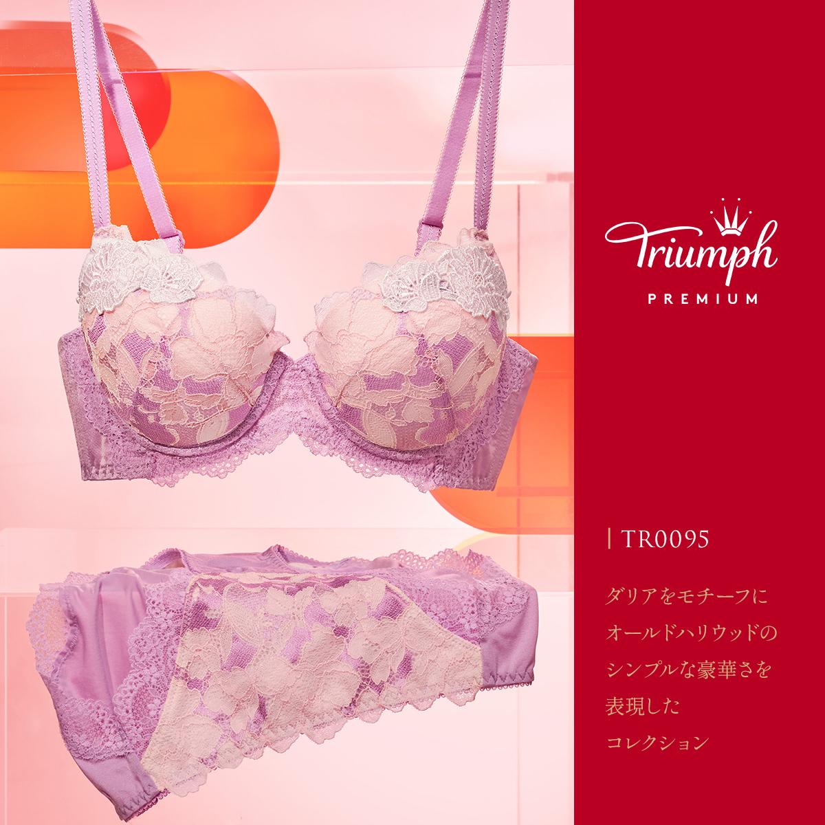 ダリアの花をモチーフに、オールドハリウッドのシンプルな豪華さを表現したTR0095シリーズ。サテンや手縫いの刺繍などをイメージしたトーナルで光沢のある網レースと、存在感のある単色のケミカルモチーフのコントラストが印象的なデザインです。