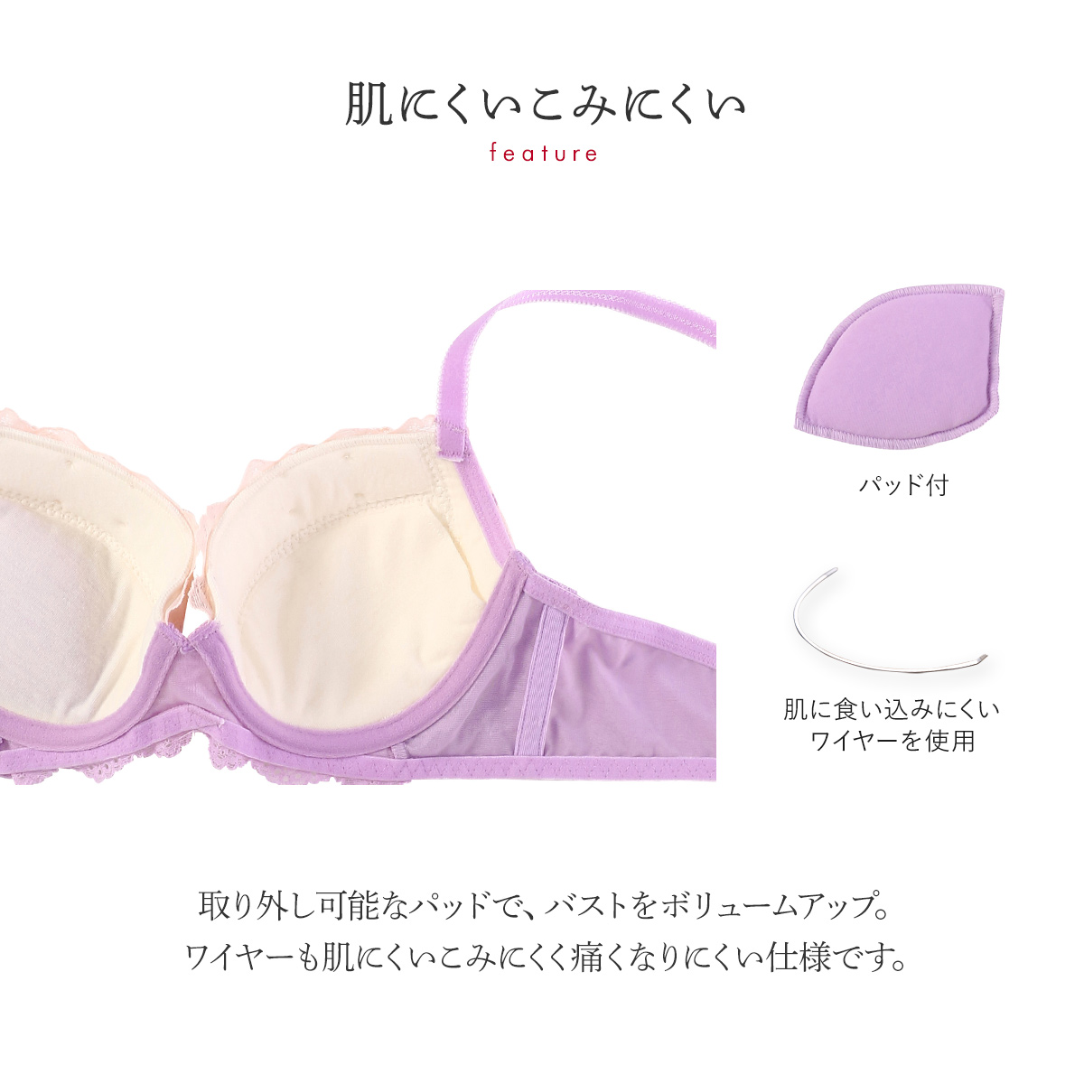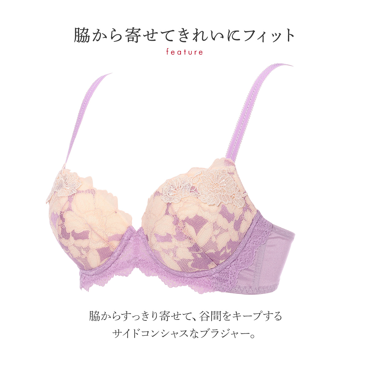 脇からすっきり寄せて、谷間をキープするサイドコンシャスなブラジャー。取り外し可能なパッド入りで、バストをボリュームアップします。フロント中心部分のワイヤーを薄くフラットにし、さらに外側に反らせた“NEWエンジェルワイヤー”を使用しているので、肌にくいこみにくく痛くなりにくい仕様です。
