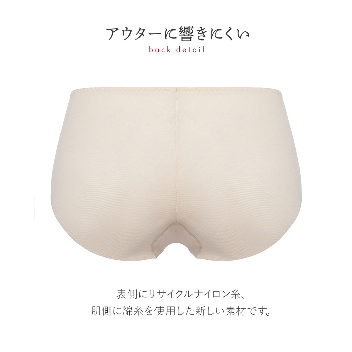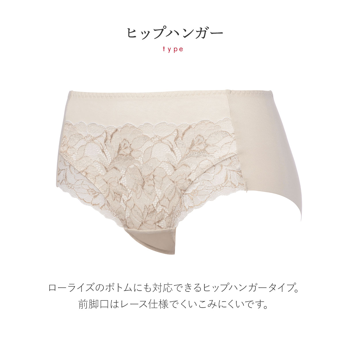 前脚口はレース仕様でくいこみにくいです。ローライズのボトムにも対応できるヒップハンガータイプです。