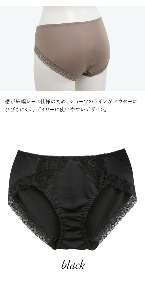 裾は細幅レース仕様のため、ショーツのラインがアウターにひびきにくく、デイリーにお使い頂きやすいデザインです。