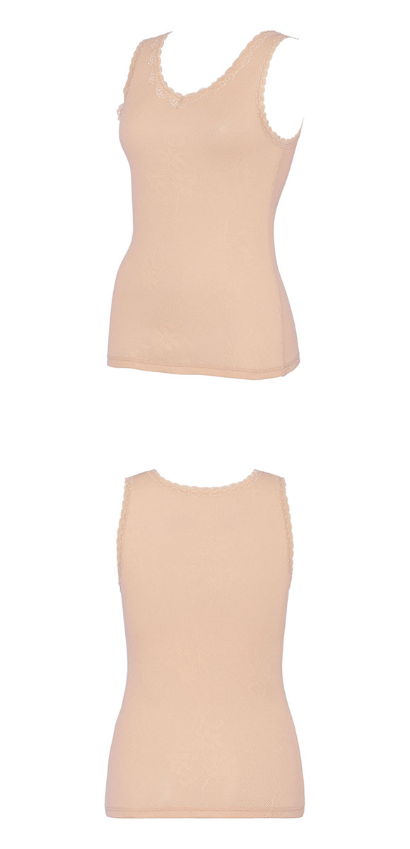 襟ぐりレースをよりカジュアルで身生地と雰囲気の合うものにアップデート。肌に直接あたりにくい仕様です。