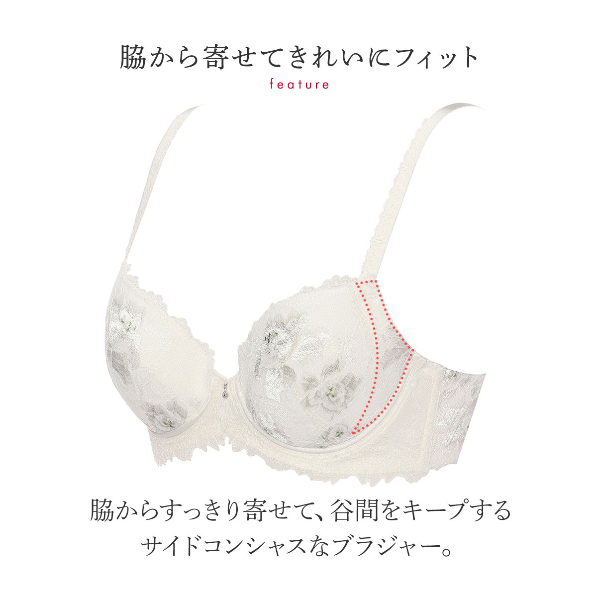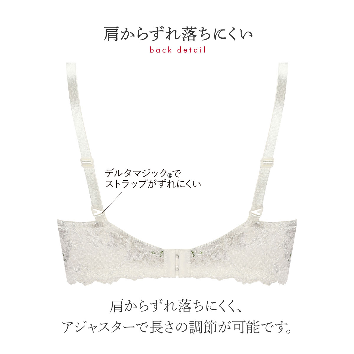 フロント中心部分のワイヤーを薄くフラットにし、さらに外側に反らせた“NEWエンジェルワイヤー”を使用しているので、肌にくいこみにくく、痛くなりにくくなっています。ストラップのとめ具には三角形の特殊な形をした、"デルタマジック"を使用しているので、肩からずれ落ちにくくなっています。