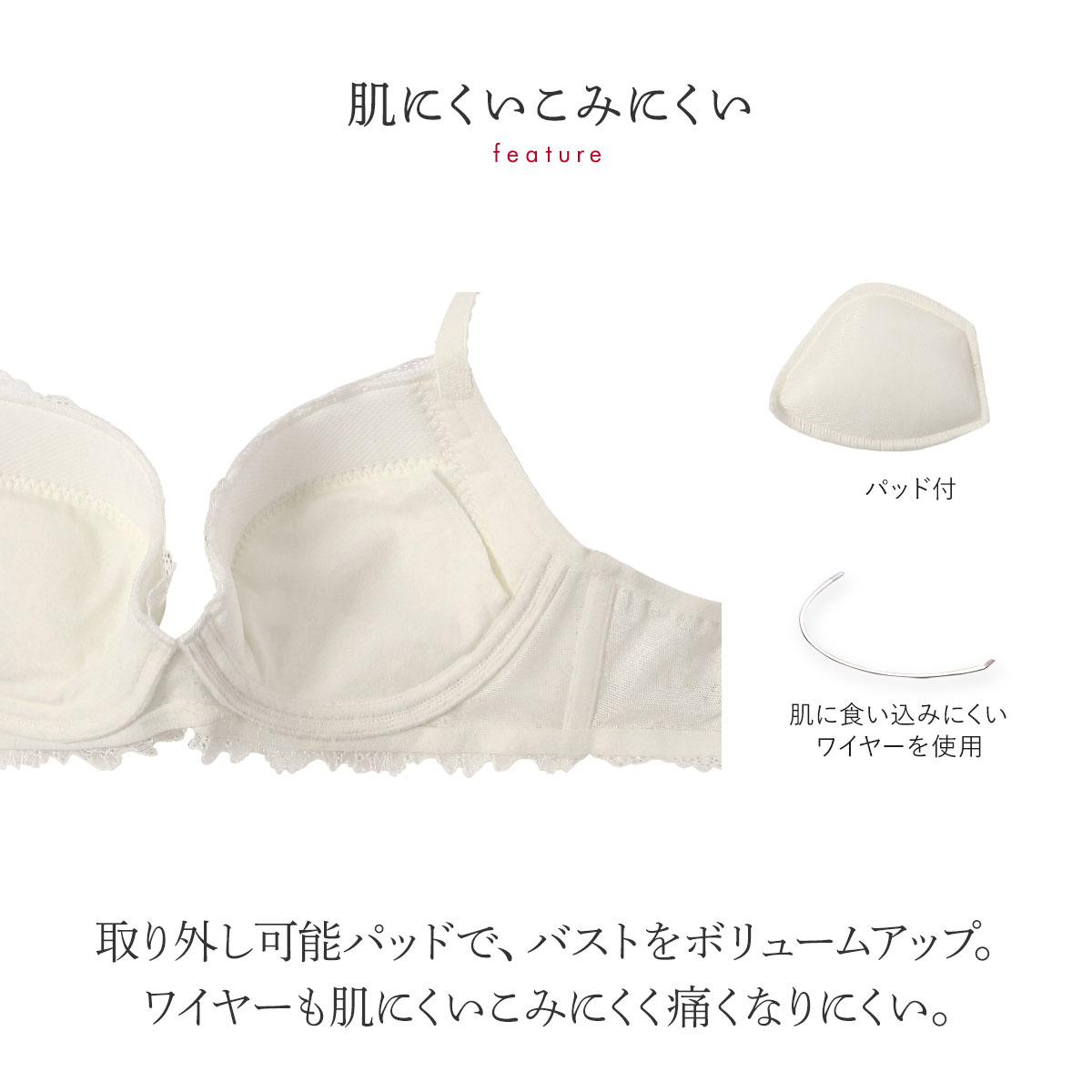 取り外し可能なパッド入りでバストをボリュームアップ。肌当たりのやさしいアウトサイドワイヤー仕様です。