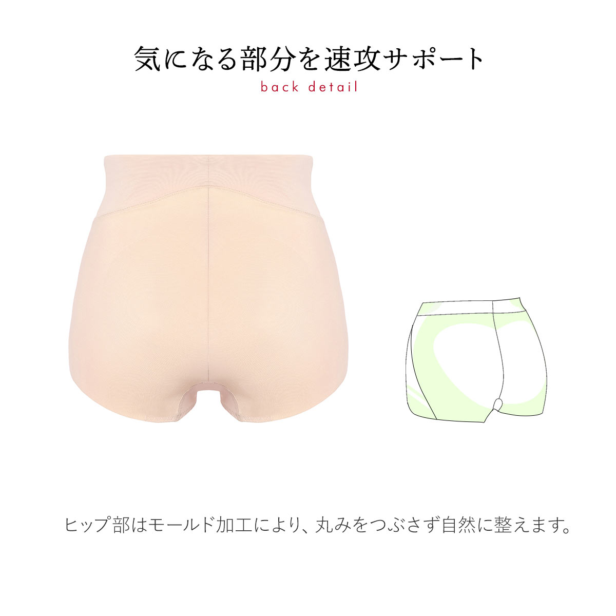 ウエストサイドのグラデーションサポートにさらにフィットする設計を加え、即効でくびれメイクします。当たりやすい前脚口部分はメッシュ組織で、伸縮性・通気性が良くなっています。腹部にも裏打を施し、気になる部分を即効サポートします。ヒップ部はモールド加工により、丸みをつぶさず自然に整えます。