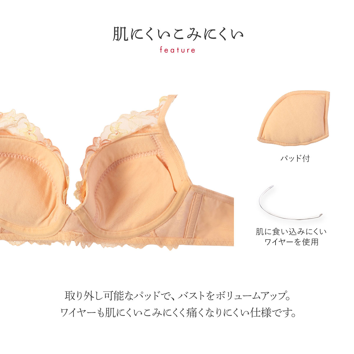 フロント中心部分のワイヤーを薄くフラットにし外側に反らせた“NEWエンジェルワイヤー”仕様なので、肌にくいこみにくく痛くなりにくくなっています。取り外し可能なパッド入りでバストをボリュームアップします。背部には、しっかり押さえて楽な着けごこちの素材を使用しています。