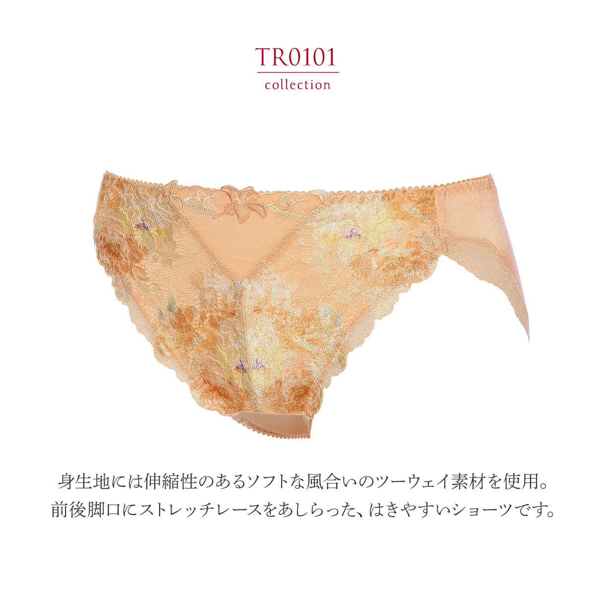 身生地には伸縮性のあるソフトな風合いのツーウェイ素材を使用。前後脚口にストレッチレースをあしらった、はきやすいショーツです。