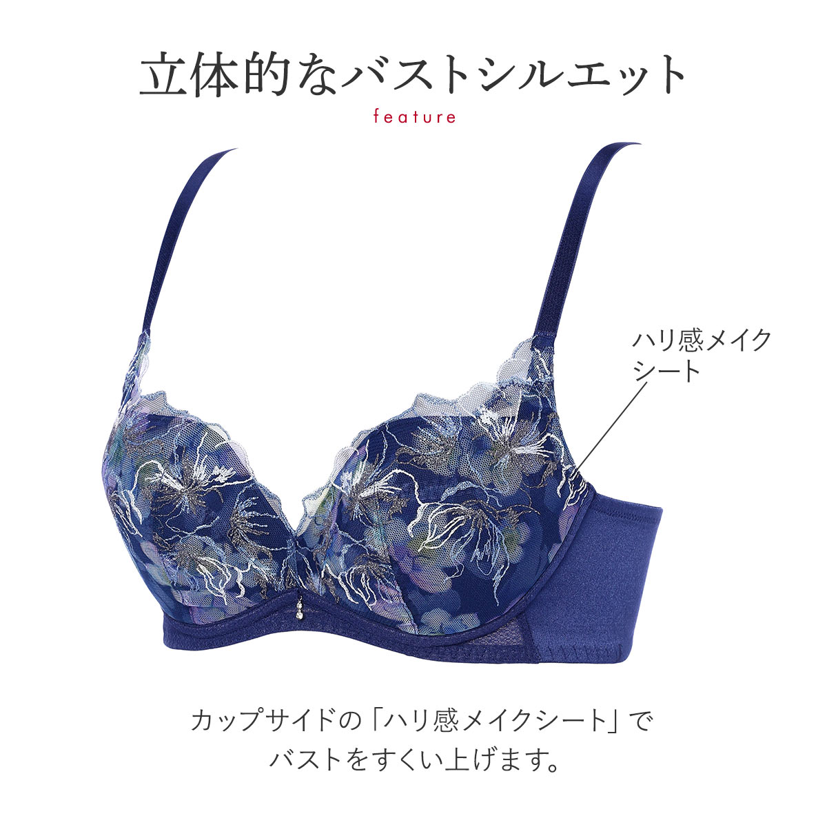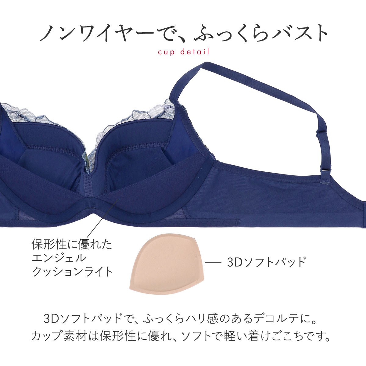 立体的で美しいバストシルエットをメイクするノンワイヤータイプです。カップサイドの「ハリ感メイクシート」でバストをすくい上げ、3Dソフトパッドでふっくらハリ感のあるデコルテに魅せます。