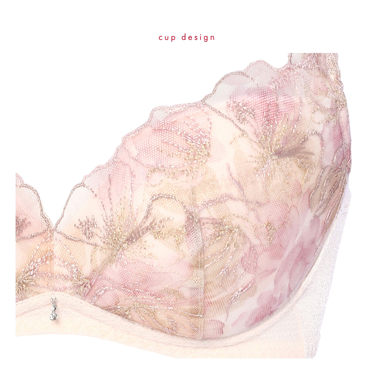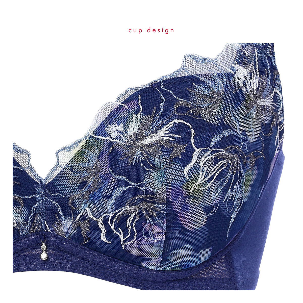 刺繍で描かれたマグノリアの花の影が美しく印象的な、天使のブラ魔法のハリ感TR580シリーズ。影をテーマに、X線で投影されたマグノリアの花の影を、鮮やかな水彩プリントとデリケートな刺繍のラインで表現しています。