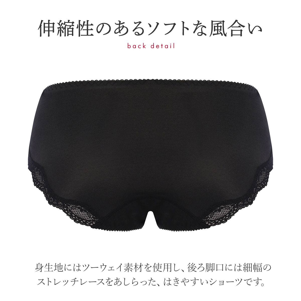 身生地には伸縮性のあるソフトな風合いのツーウェイ素材を使用しています。前脚口にはメインのストレッチレースを、後ろ脚口には細幅のストレッチレースをあしらった、はきやすいショーツです。