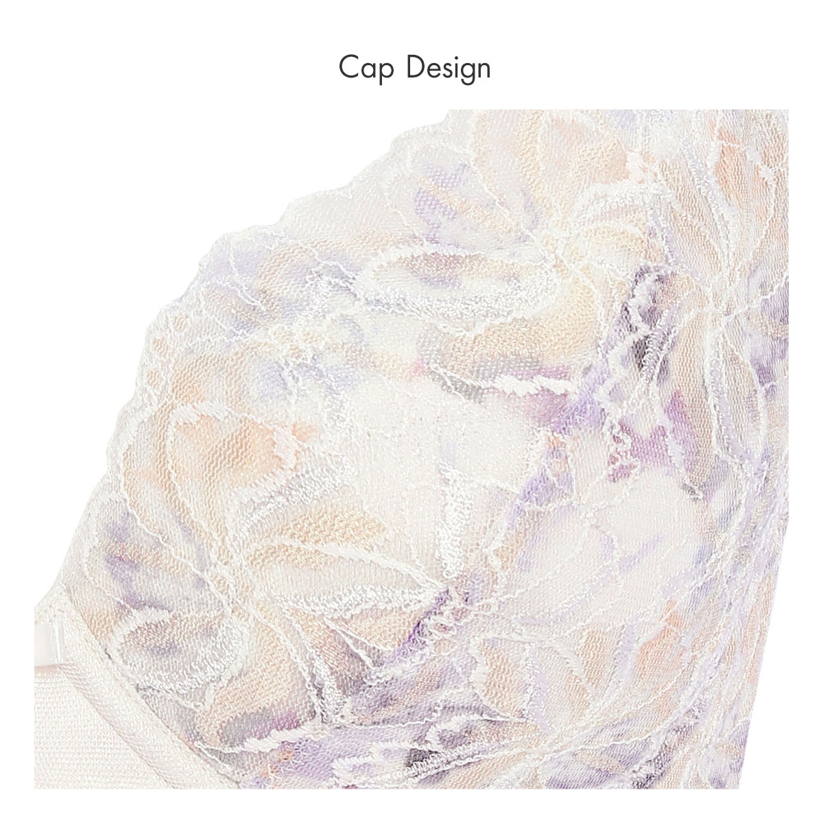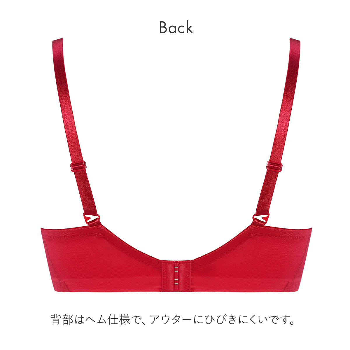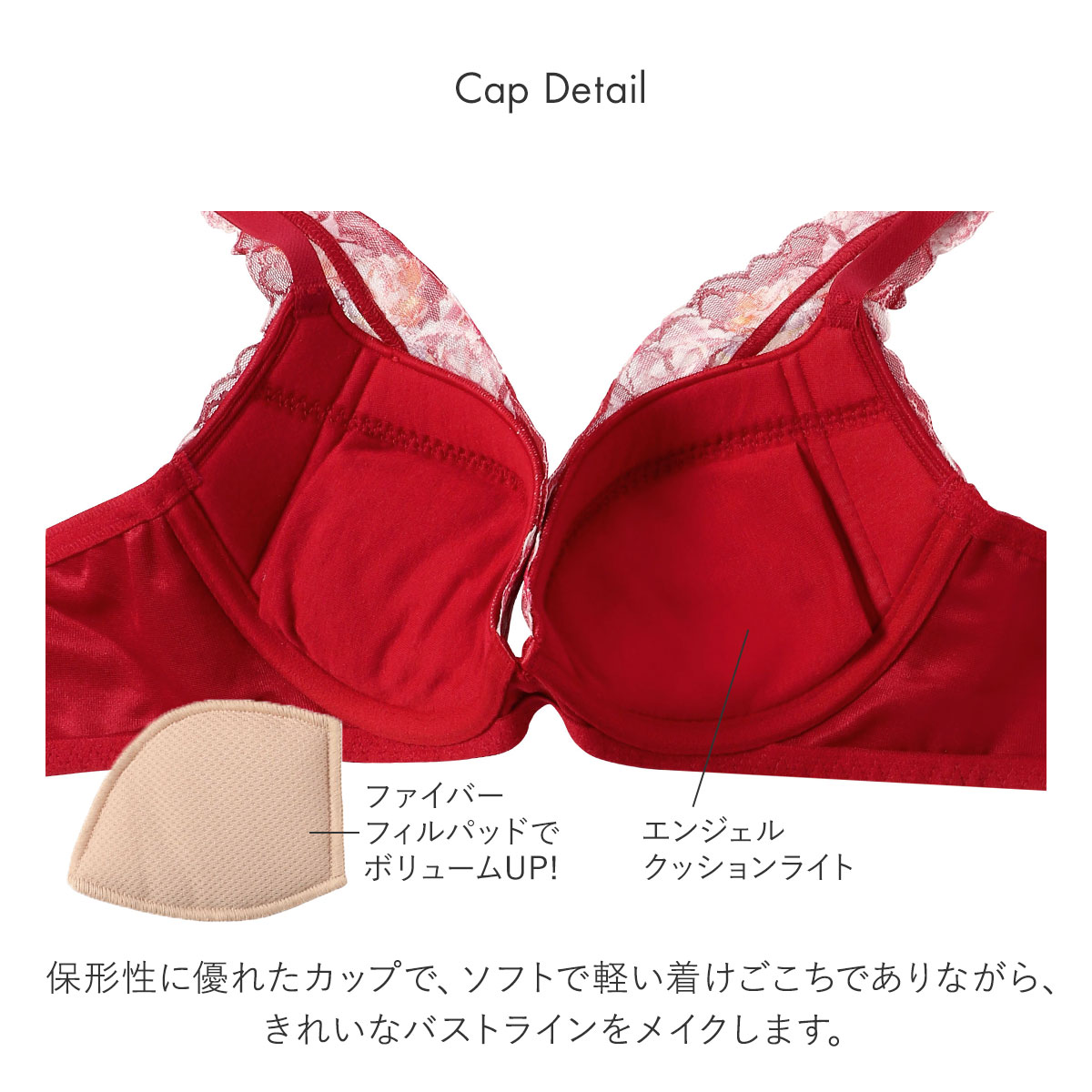保形性に優れたカップ素材、"エンジェルクッション(R)ライト"を使用。ソフトで軽い着けごこちでありながら、きれいなバストラインをメイクします。ファイバーフィルパッドで、ボリュームもアップ。フロント中心部分のワイヤーを薄くフラットにし外側に反らせた“NEWエンジェルワイヤー(R)”仕様なので、肌にくいこみにくいです。