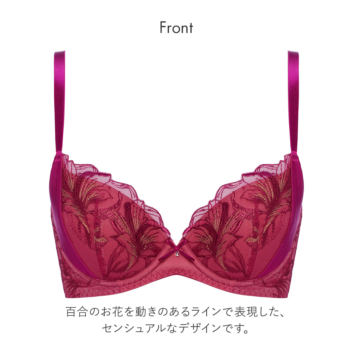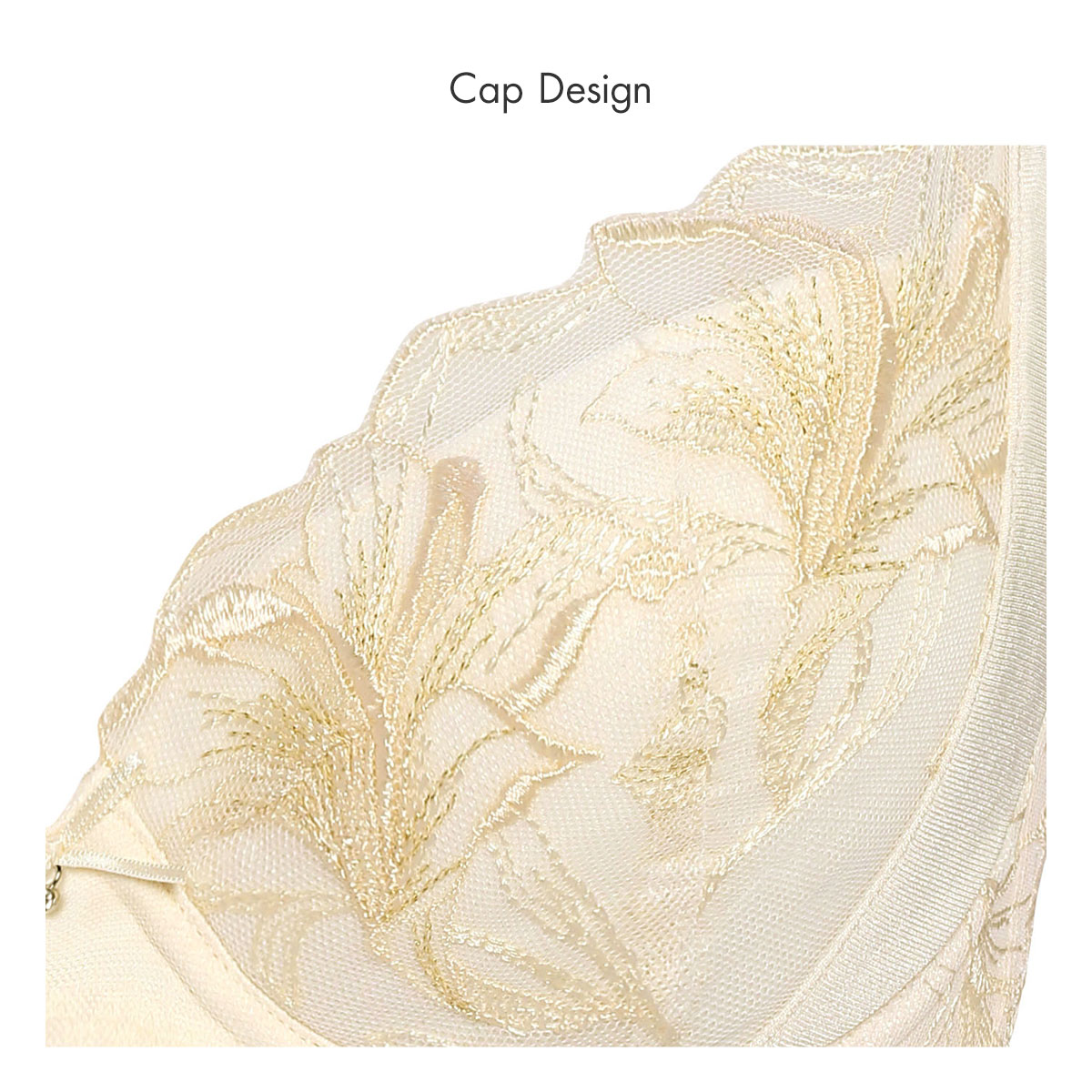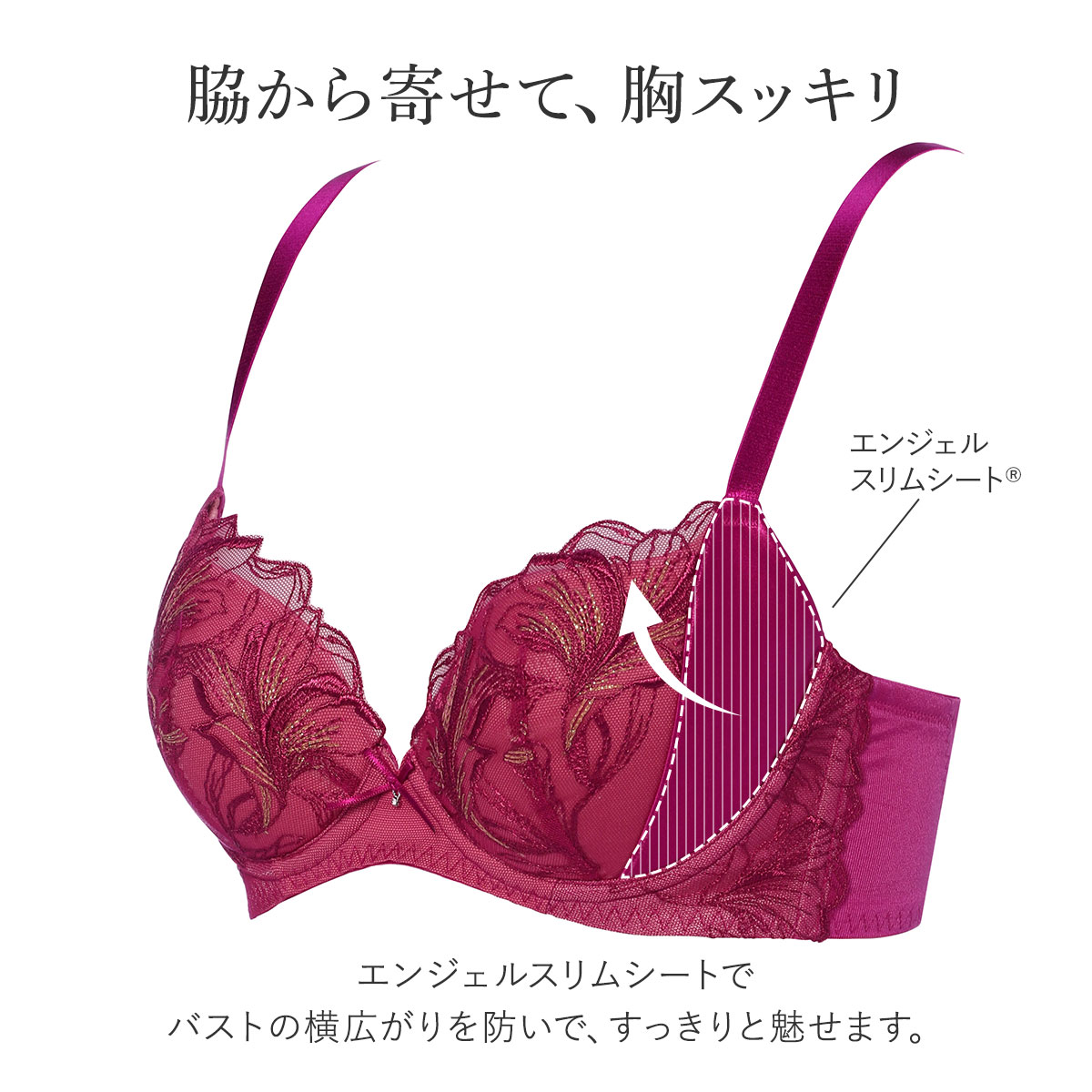 外側と肌側で硬さの異なる二層構造の素材、"エンジェルスリムシート(R)"をカップサイドに使用。バストの横広がりを防いで、すっきりと見せます。保形性に優れたカップ素材、"エンジェルクッション(R)ライト"を使用。ソフトで軽い着けごこちでありながら、きれいなバストラインをメイクします。
