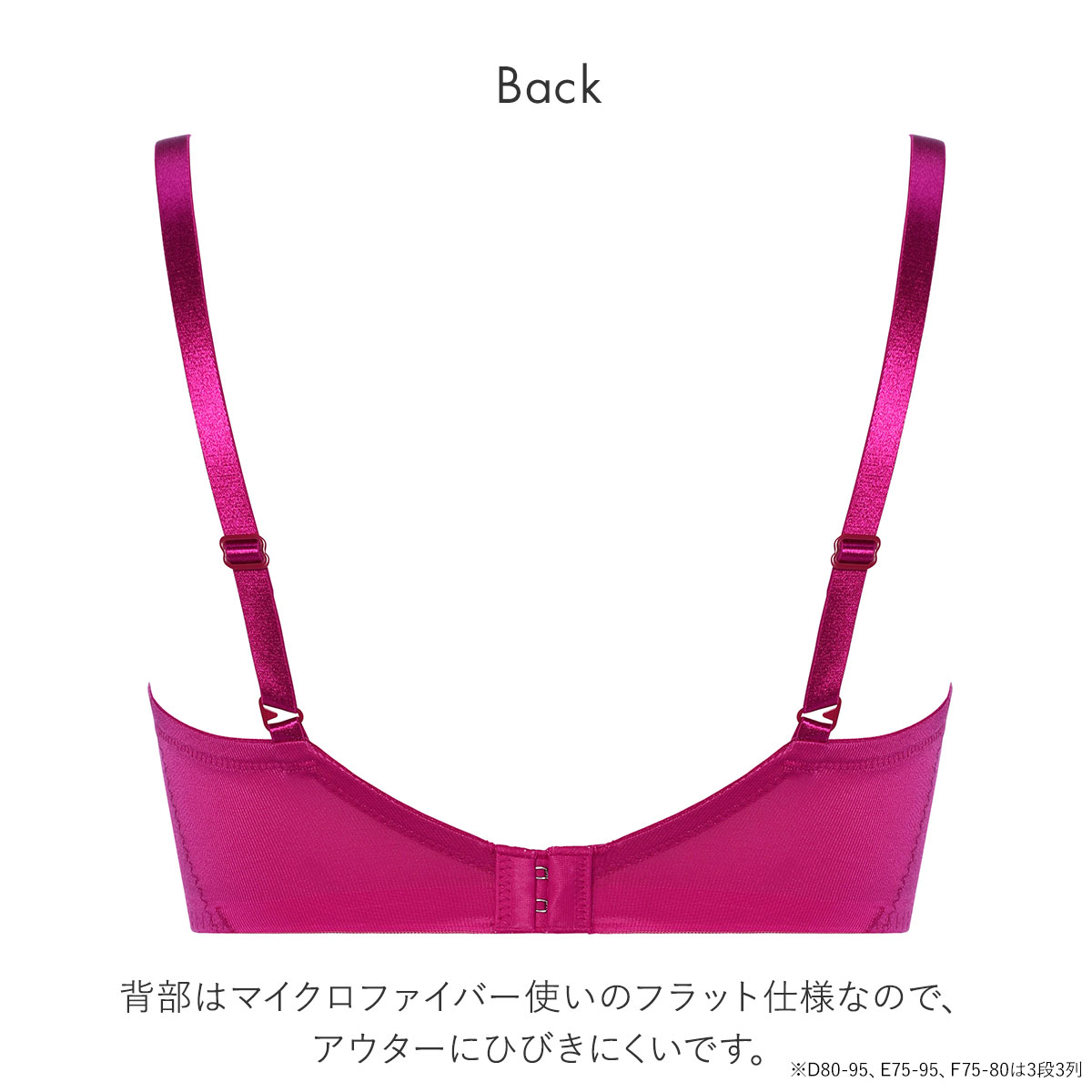 背部はマイクロファイバー使いのフラット仕様なので、アウターにひびきにくいです。フロント中心部分のワイヤーを薄くフラットにし、外側に反らせた"NEWエンジェルワイヤー(R)"仕様で、肌にくいこみにくく痛くなりにくいです。