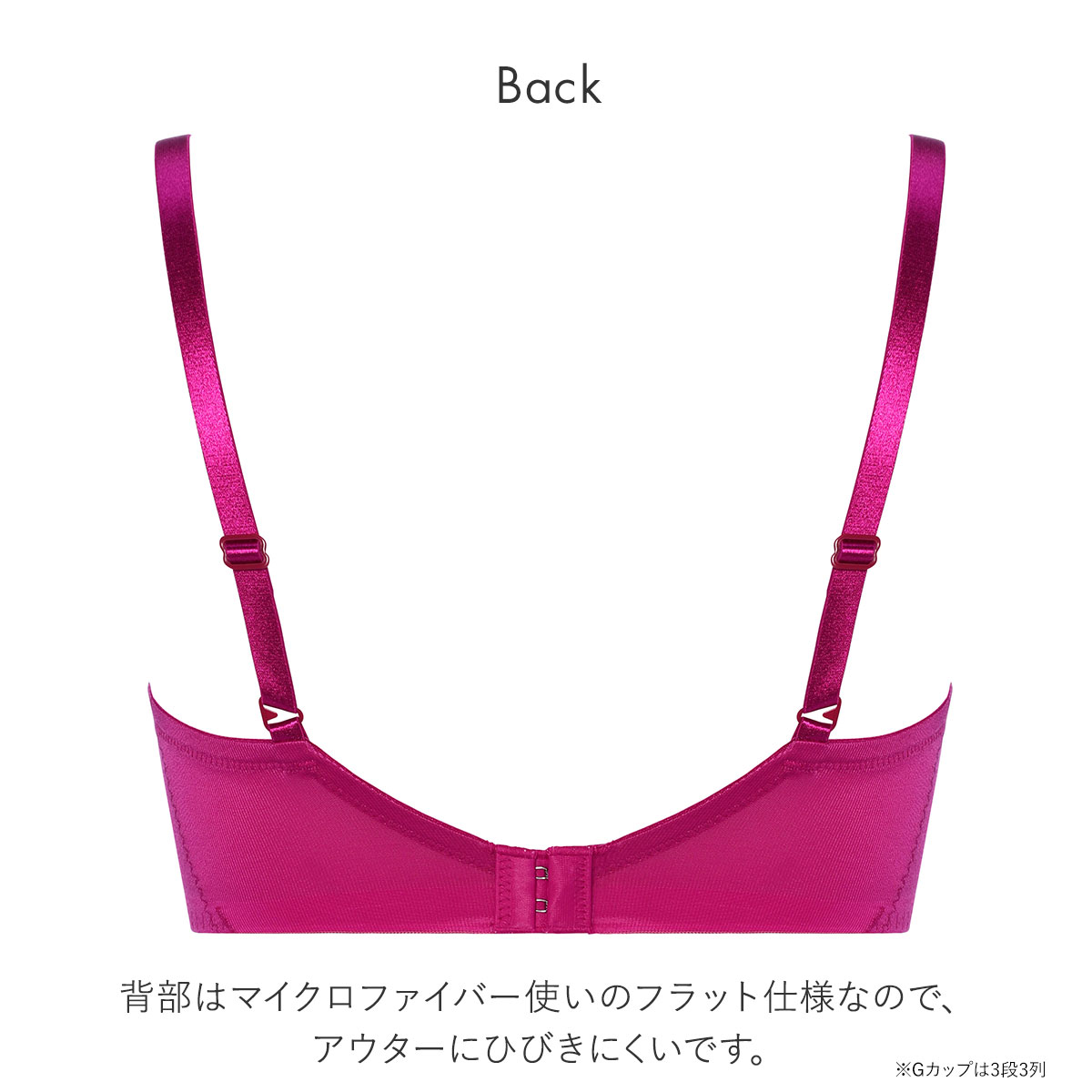 背部はマイクロファイバー使いのフラット仕様なので、アウターにひびきにくいです。フロント中心部分のワイヤーを薄くフラットにし、外側に反らせた"NEWエンジェルワイヤー(R)"仕様で、肌にくいこみにくく痛くなりにくいです。