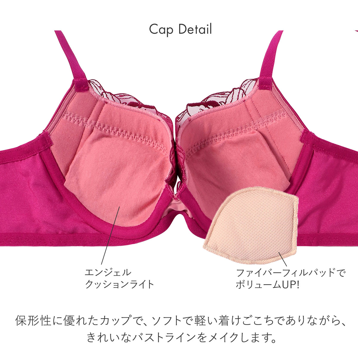 外側と肌側で硬さの異なる二層構造の素材、"エンジェルスリムシート(R)"をカップサイドに使用。バストの横広がりを防いで、すっきりと見せます。保形性に優れたカップ素材、"エンジェルクッション(R)ライト"を使用。ソフトで軽い着けごこちでありながら、きれいなバストラインをメイクします。