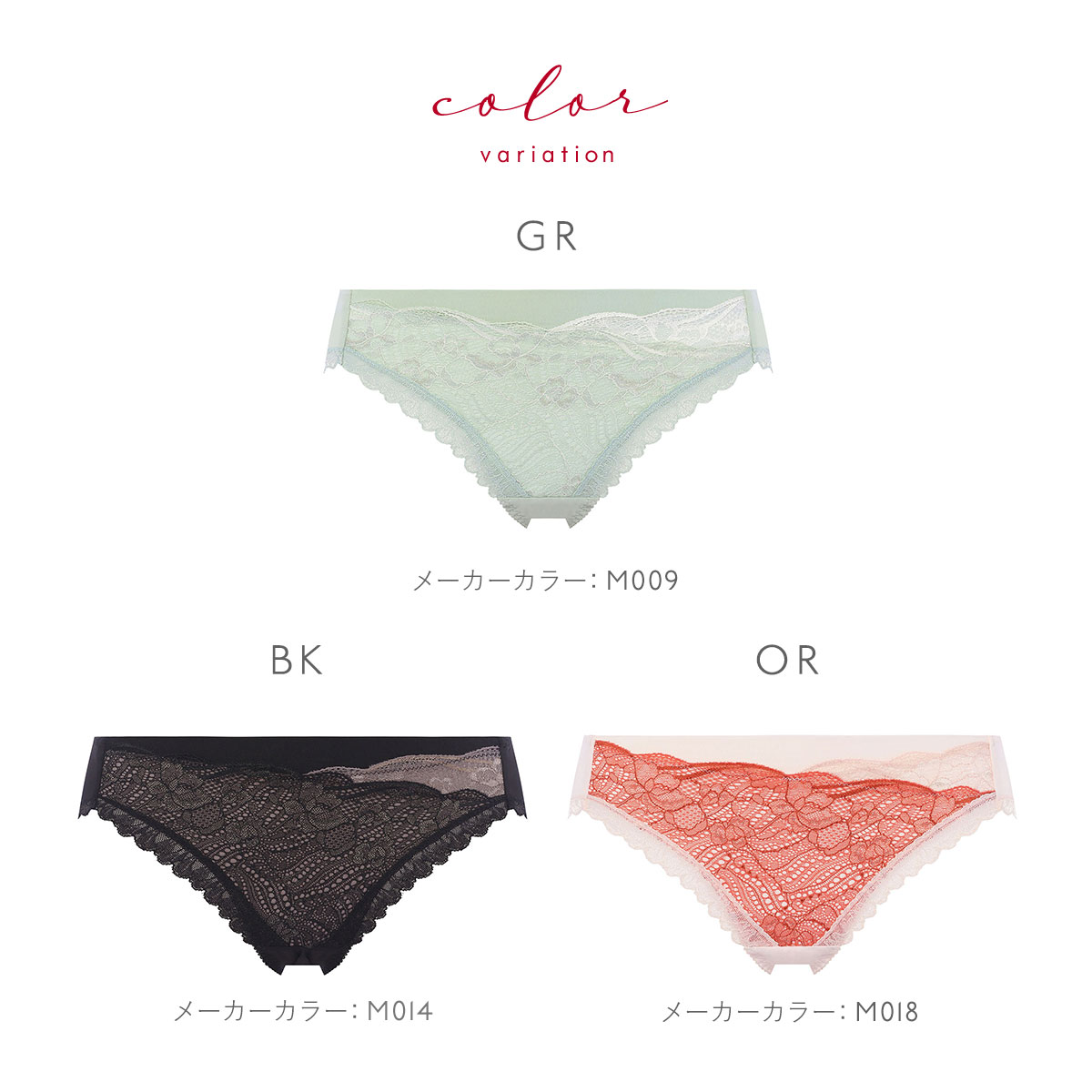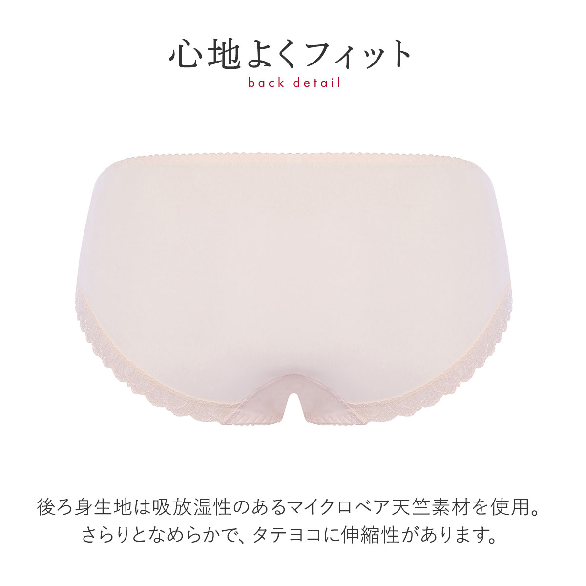 おなか部分はゴムを使わない折り返し始末で、くいこみを軽減。前後脚口にはやわらかなストレッチレースを使用し、アウターにひびきにくく、はき心地よく仕上げています。