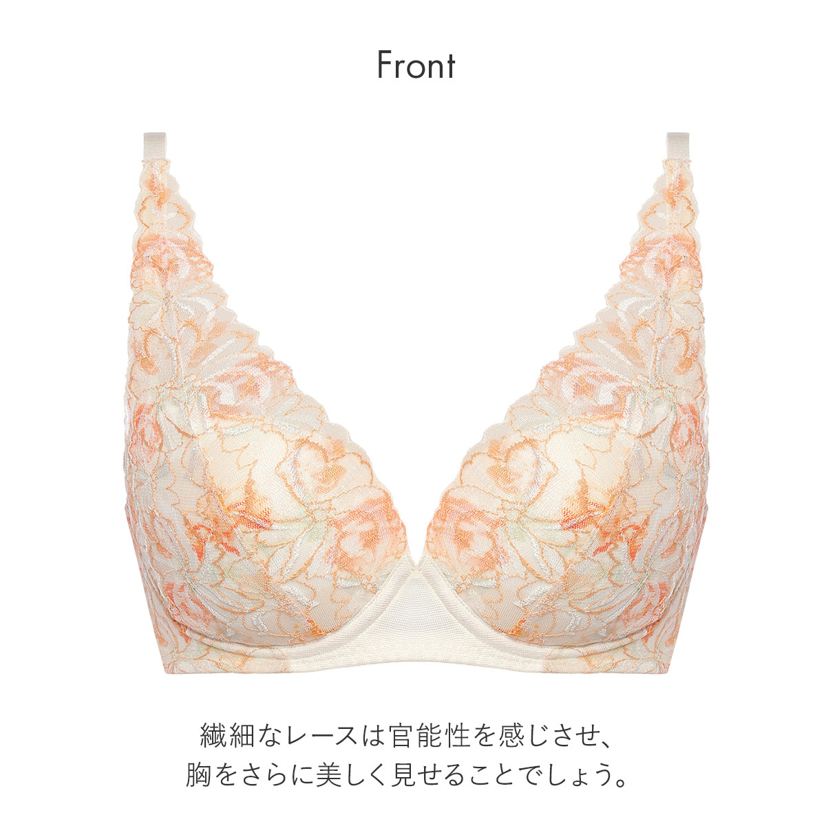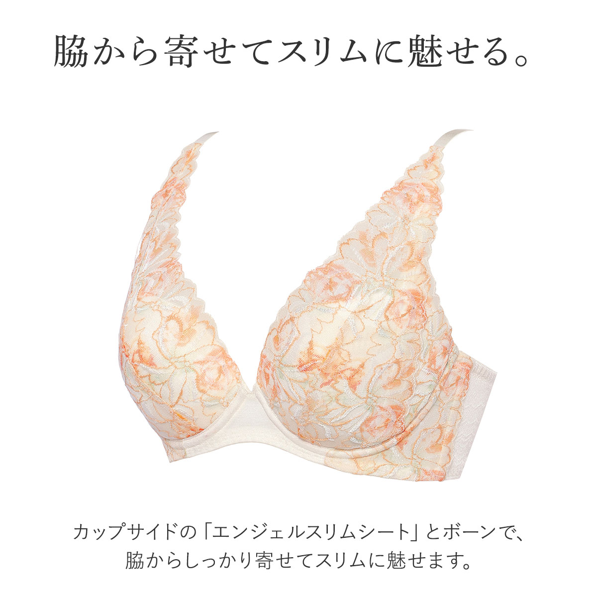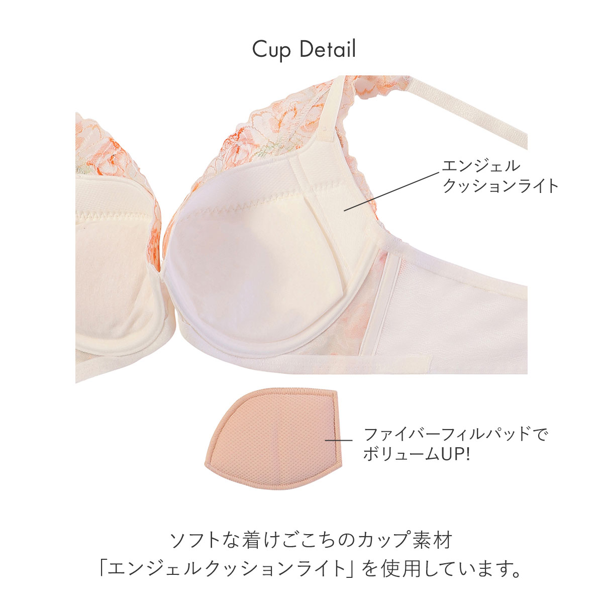 カップサイドの「エンジェルスリムシート」とボーンで、脇からしっかり寄せてスリムに魅せます。保形性・通気性・耐久性に優れ、ソフトな着けごこちのカップ素材、「エンジェルクッションライト」を使用しています。ファイバーフィルパッドでボリュームアップ!