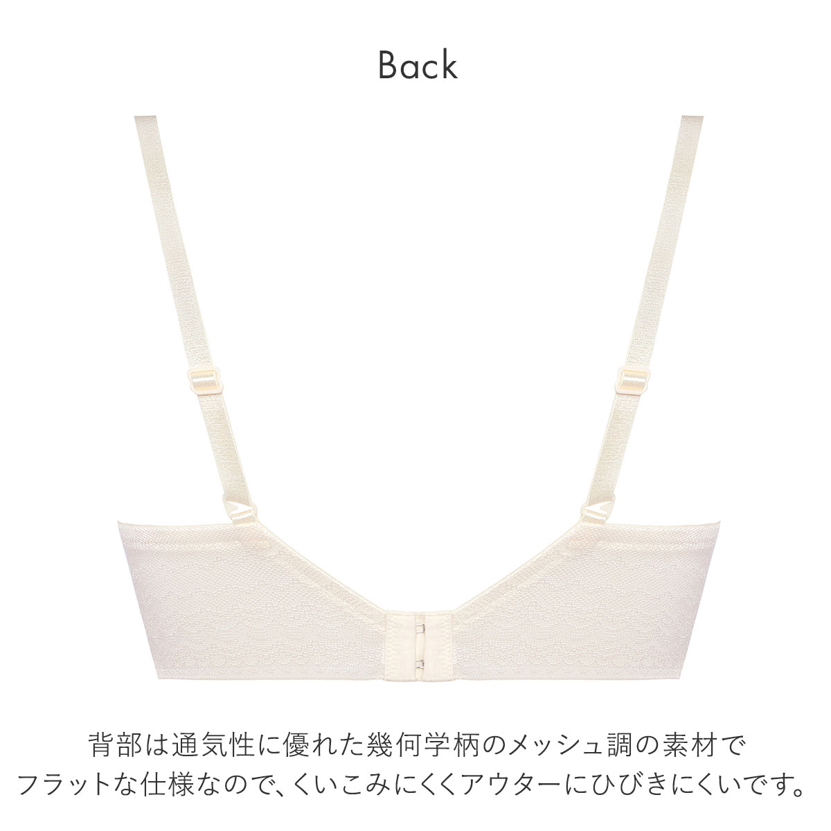 背部は通気性に優れた幾何学柄のメッシュ調の素材でフラットな仕様なので、くいこみにくくアウターにひびきにくいです。サイド部分は裏打ち仕様のため、脇をしっかり押さえます。前中心部のワイヤーを薄くフラットにし外側に反らせた「NEWエンジェルワイヤー」仕様のため、肌にくいこみにくく痛くなりにくくなっています。