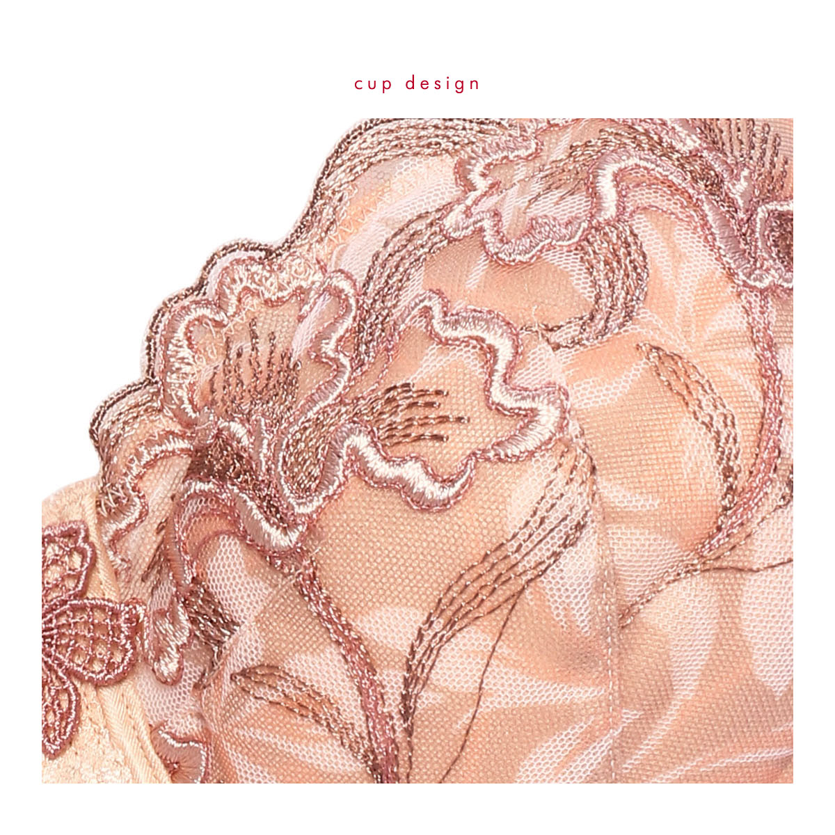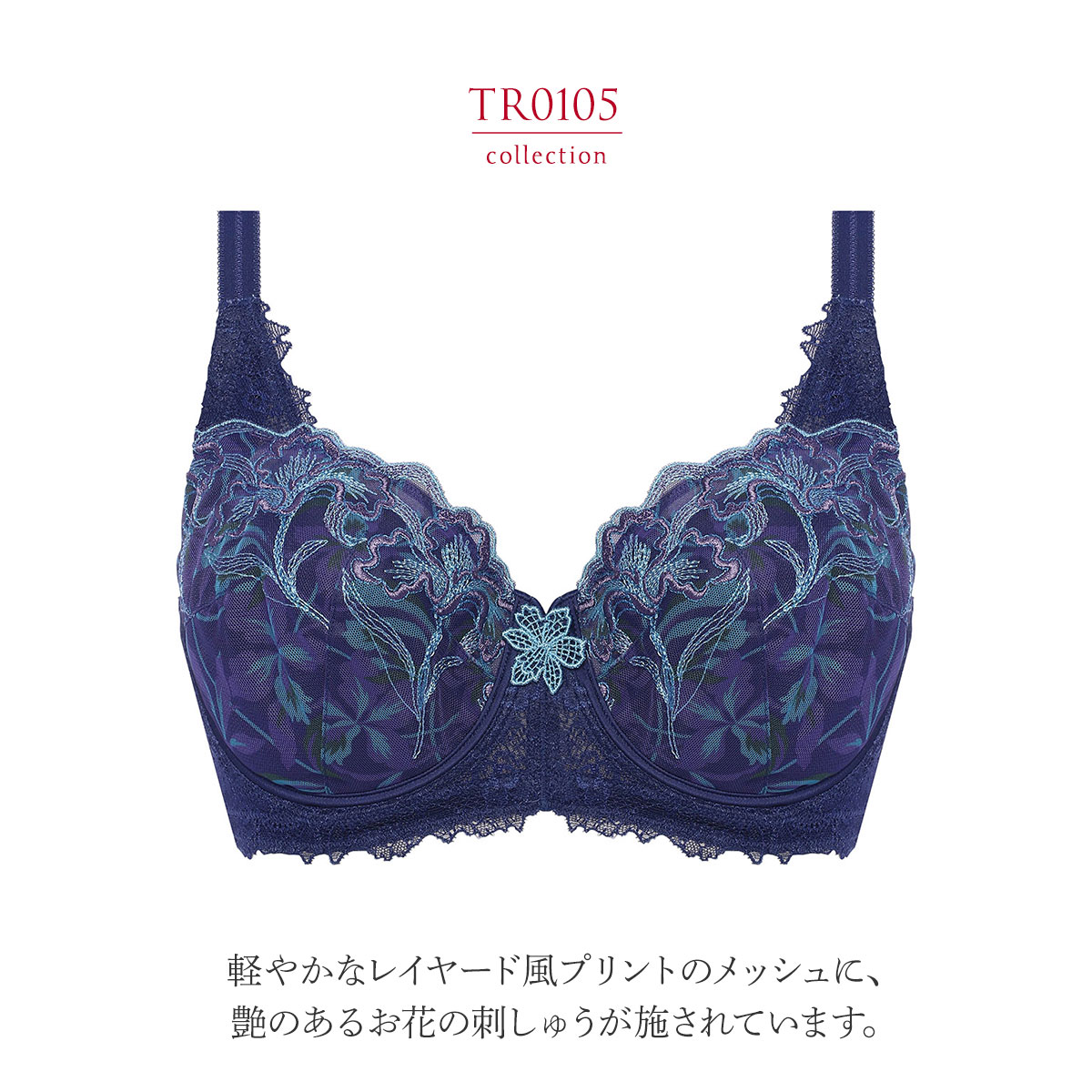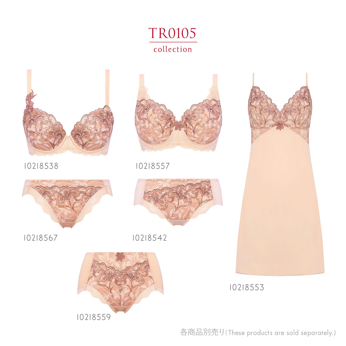 レッドレーベル バイ トリンプTR0105シリーズは、「世界の四大洋ラン」のひとつでもある、豪華な姿のデンドロビュームがインスピレーションの、アールヌーボーの曲線を使って表現されたデザインです。テーマに合わせたプリントのメッシュに、艶のあるお花の刺しゅうが施されています。