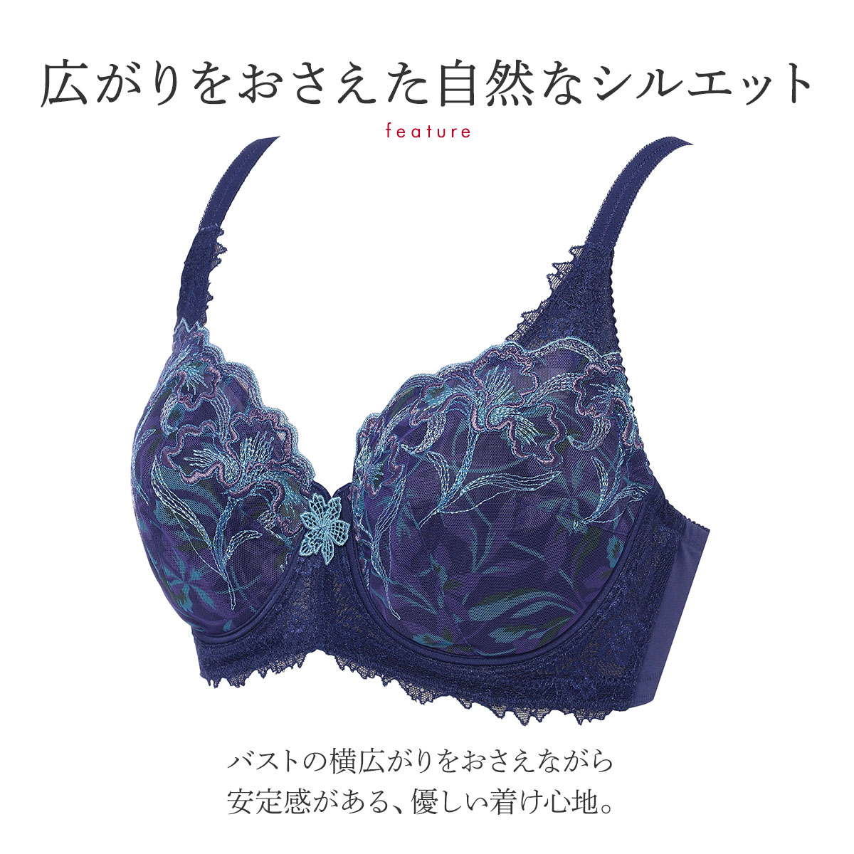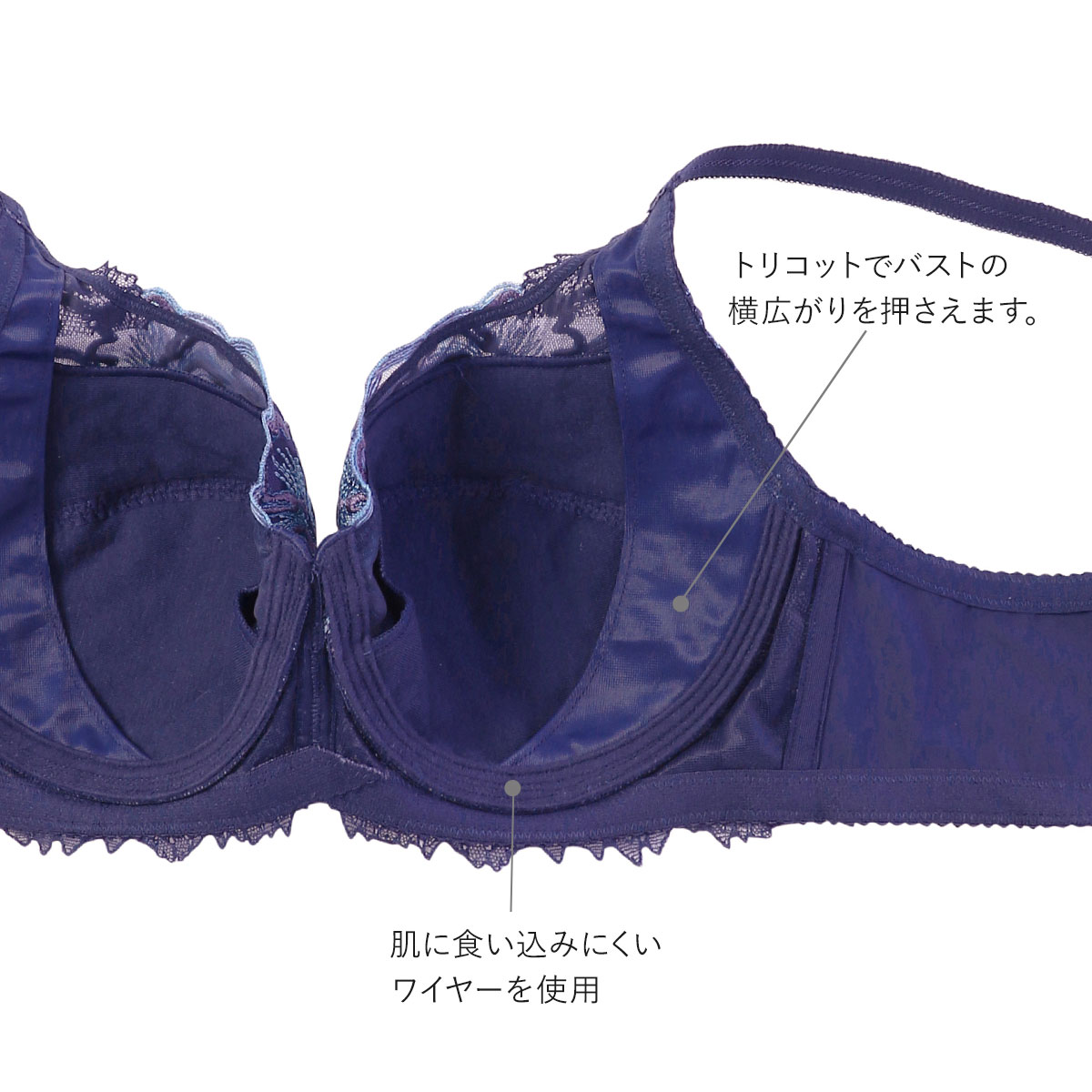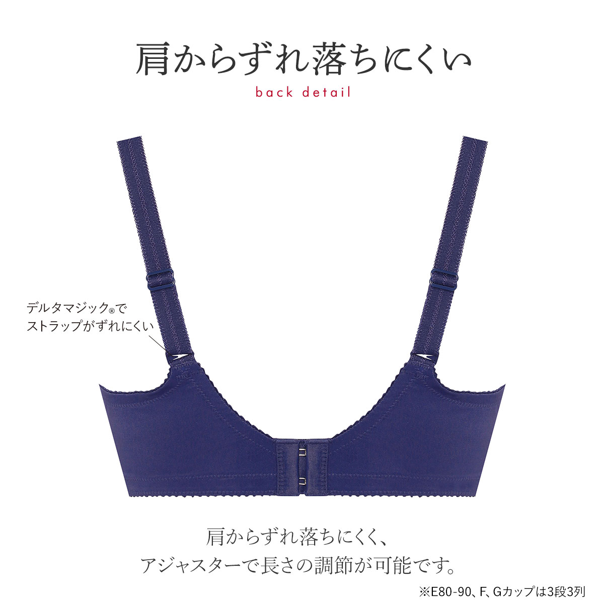 カップ内側の三日月型のトリコットがバストの横広がりを押さえ、豊かなバストをすっきりと自然なラインに整えます。前中心部のワイヤーを薄くフラットにし外側に反らせたNEW"エンジェルワイヤー(R)"仕様なので、肌にくいこみにくく痛くなりにくくなっています。肌当たりがやさしいアウトサイドワイヤー仕様。背部には、しっかり抑えて楽な着けごこちの素材を使用しています。