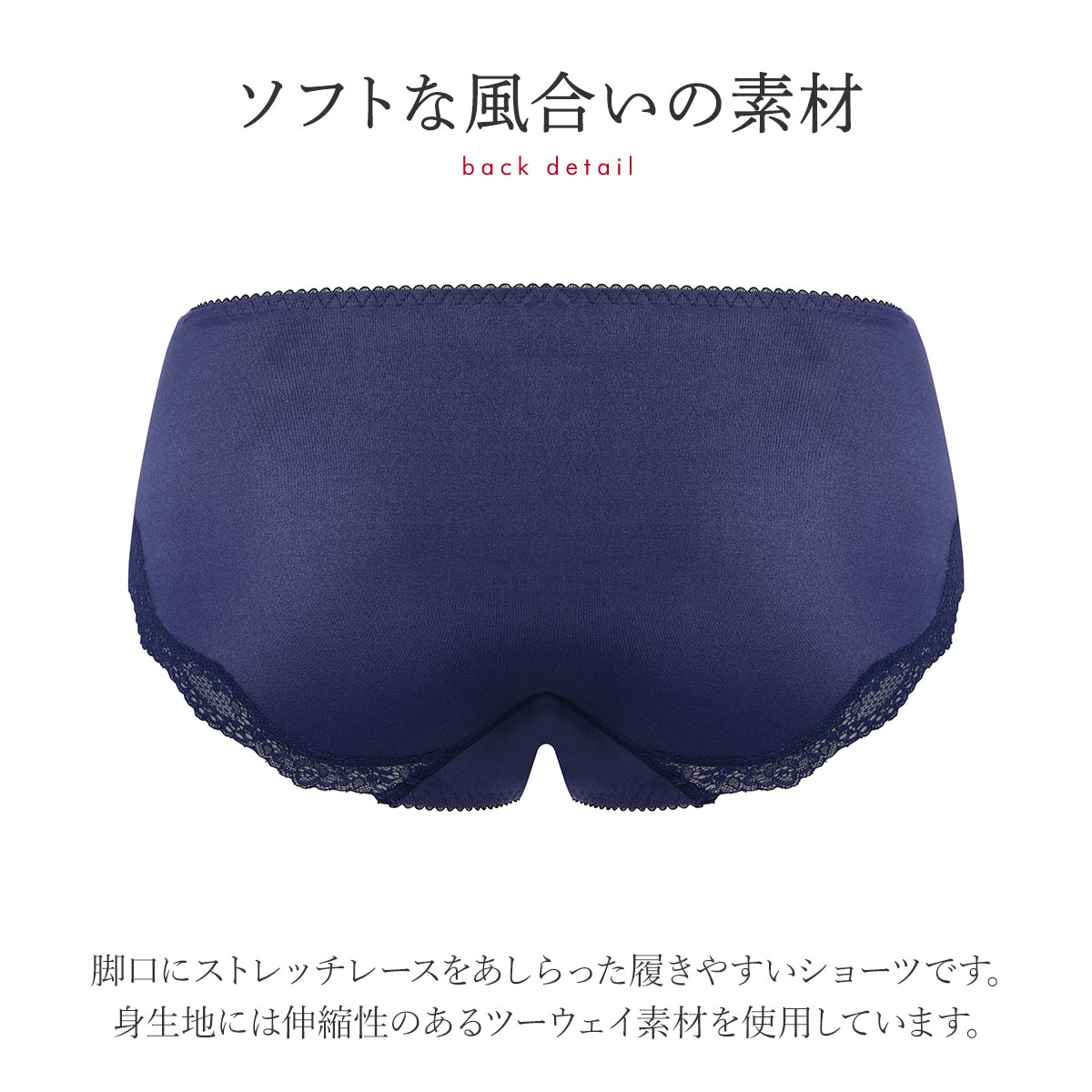 身生地には伸縮性のあるソフトな風合いのツーウェイ素材を使用。前後脚口にストレッチレースをあしらった、はきやすいショーツです。