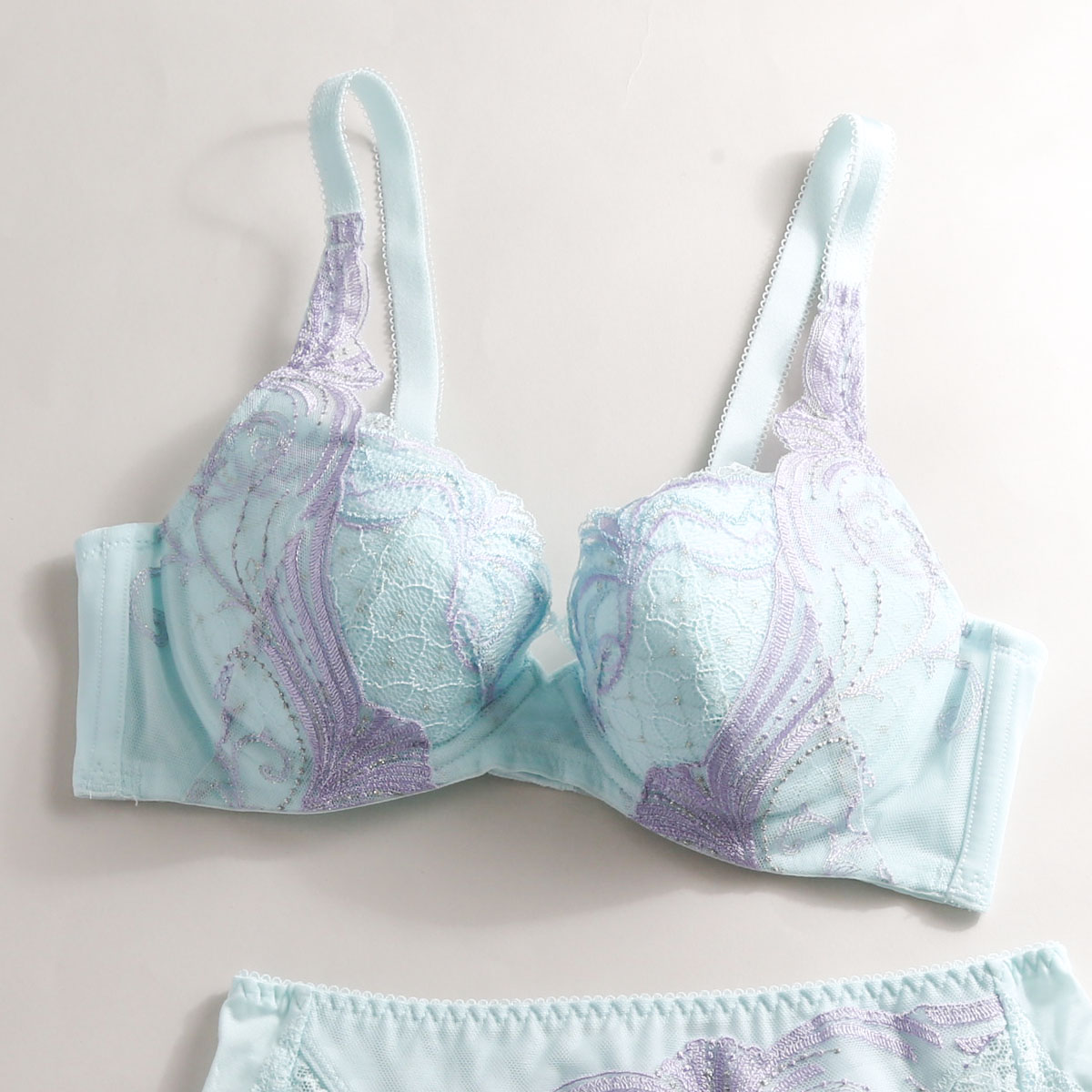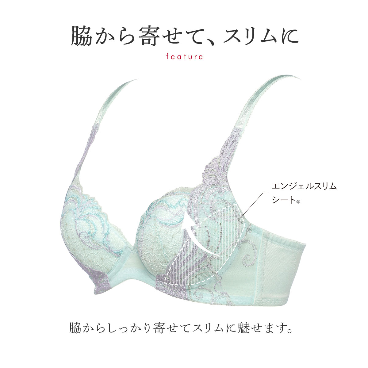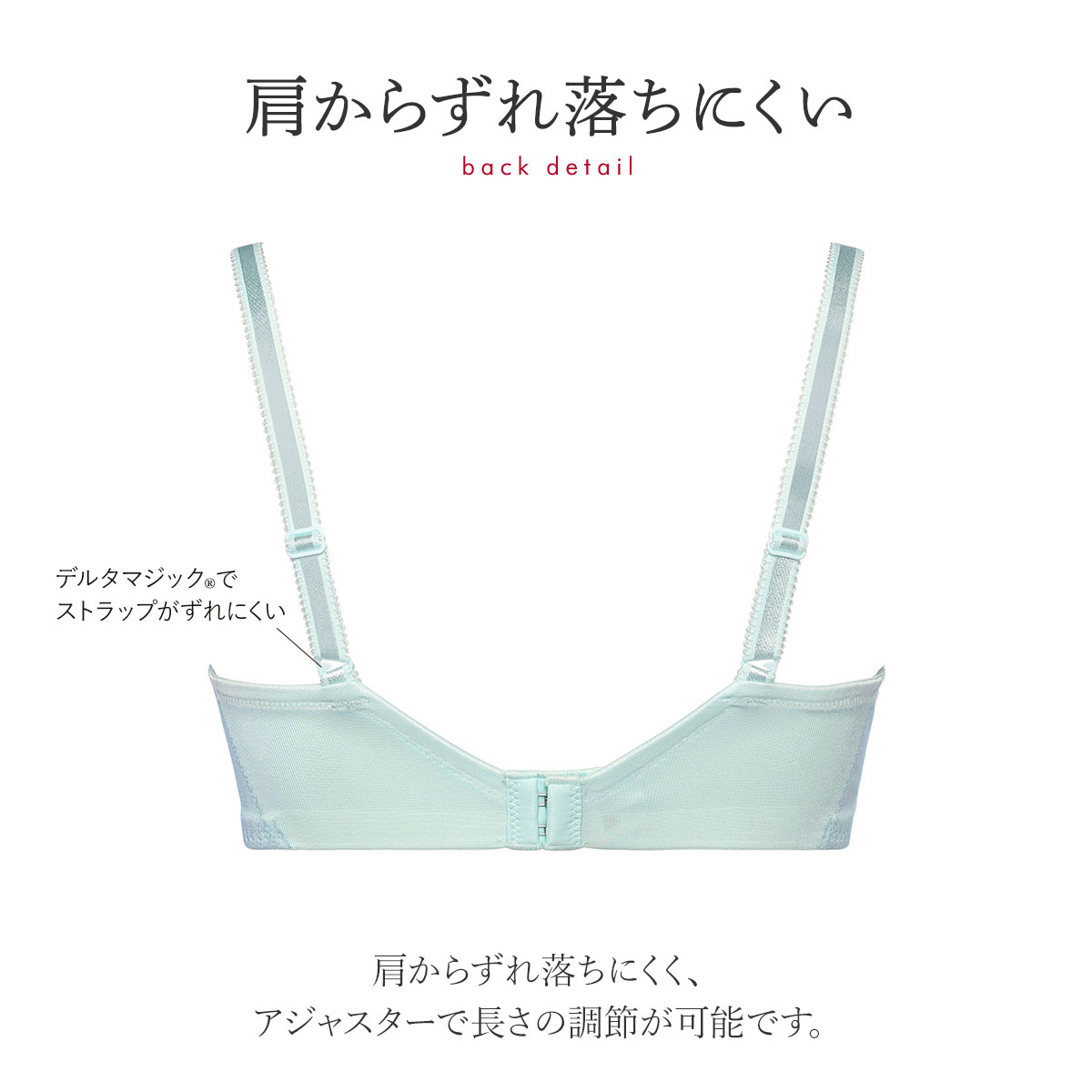 前中心部のワイヤーを薄くフラットにし外側に反らせた「NEWエンジェルワイヤー(R)」仕様なので、肌にくいこみにくく痛くなりにくいです。ストラップのとめ具には三角形の特殊な形をした「デルタマジック(R)」を使用しているので、肩からずれ落ちにくくなっています。