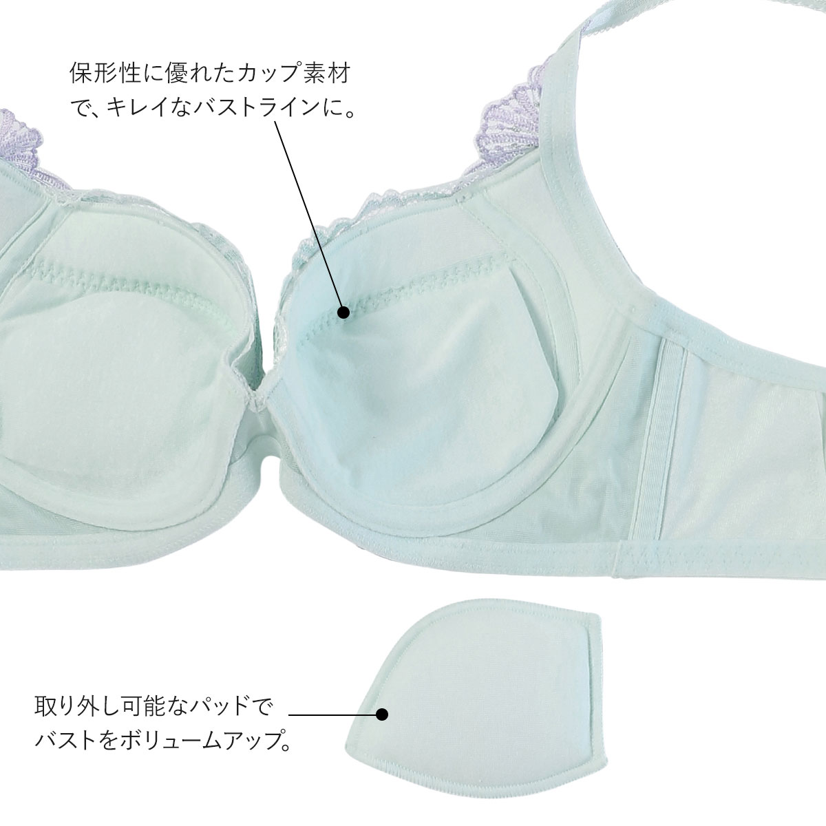 保形性に優れたカップ素材、「エンジェルクッション(R)ライト」を使用。ソフトで軽い着けごこちでありながら、きれいなバストラインをメイクします。