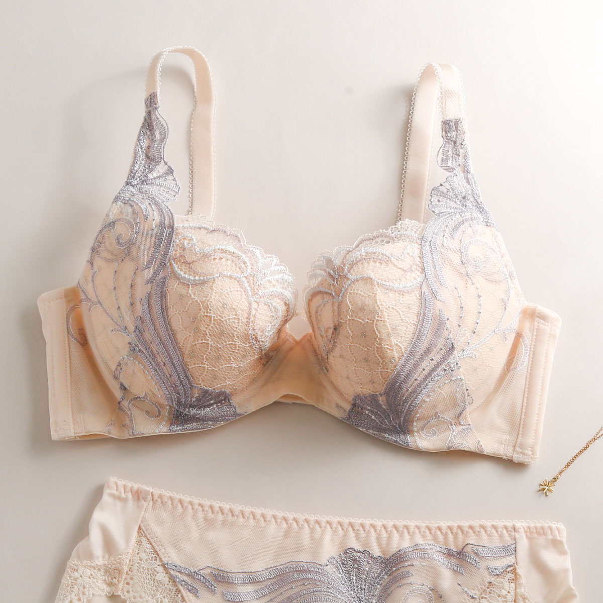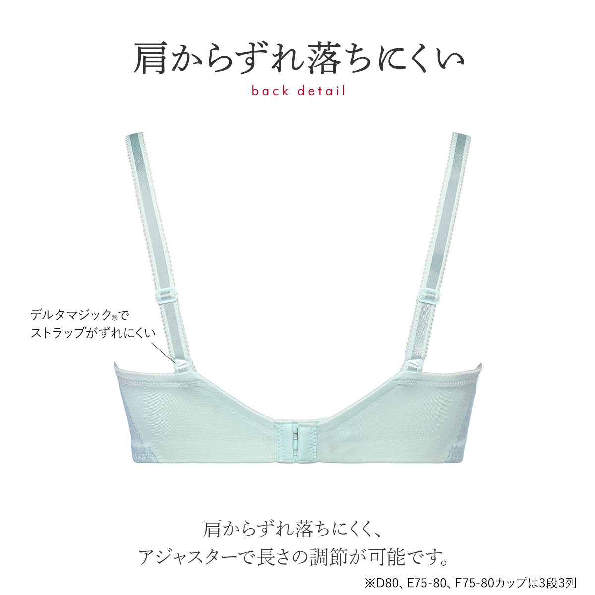 前中心部のワイヤーを薄くフラットにし外側に反らせた「NEWエンジェルワイヤー(R)」仕様なので、肌にくいこみにくく痛くなりにくいです。ストラップのとめ具には三角形の特殊な形をした「デルタマジック(R)」を使用しているので、肩からずれ落ちにくくなっています。