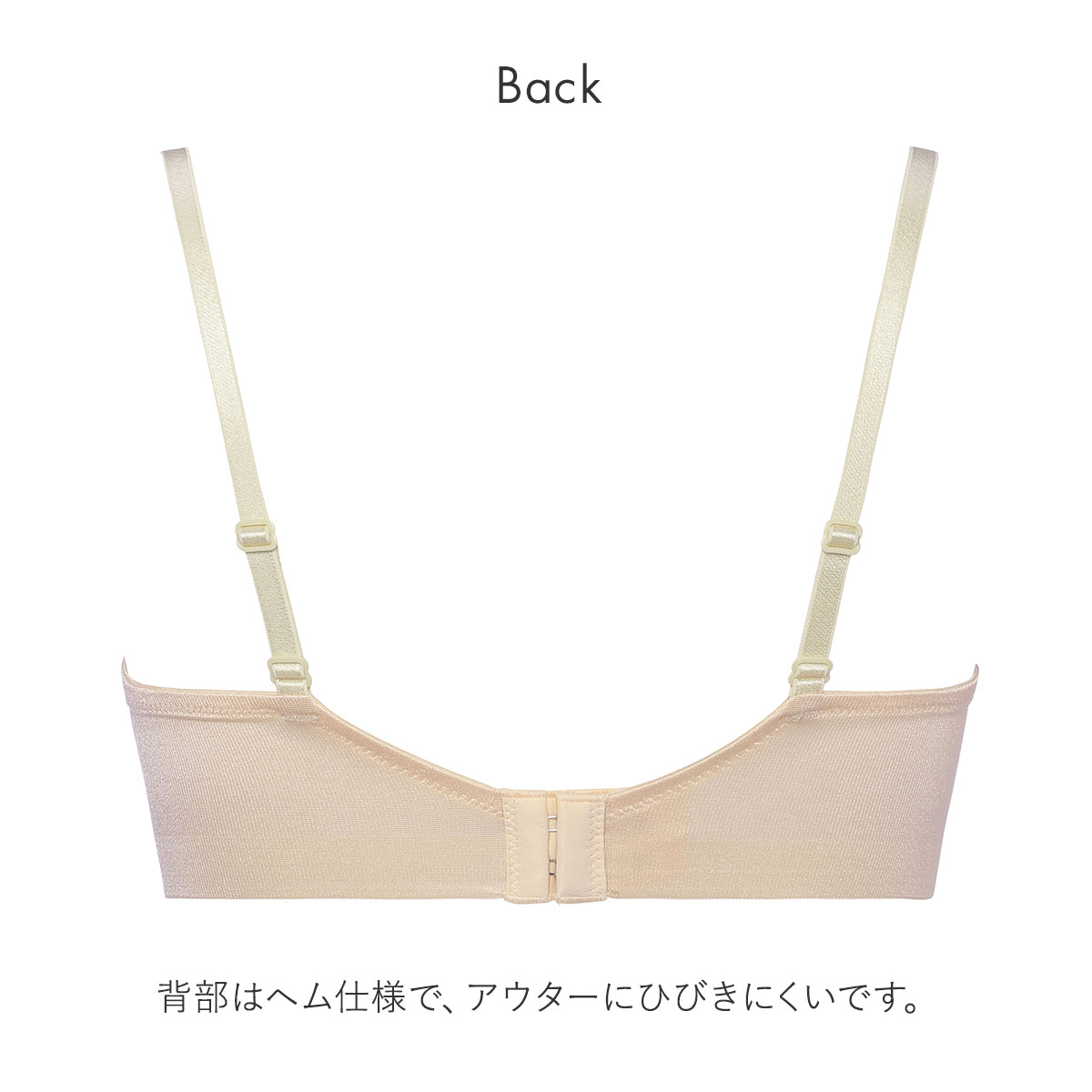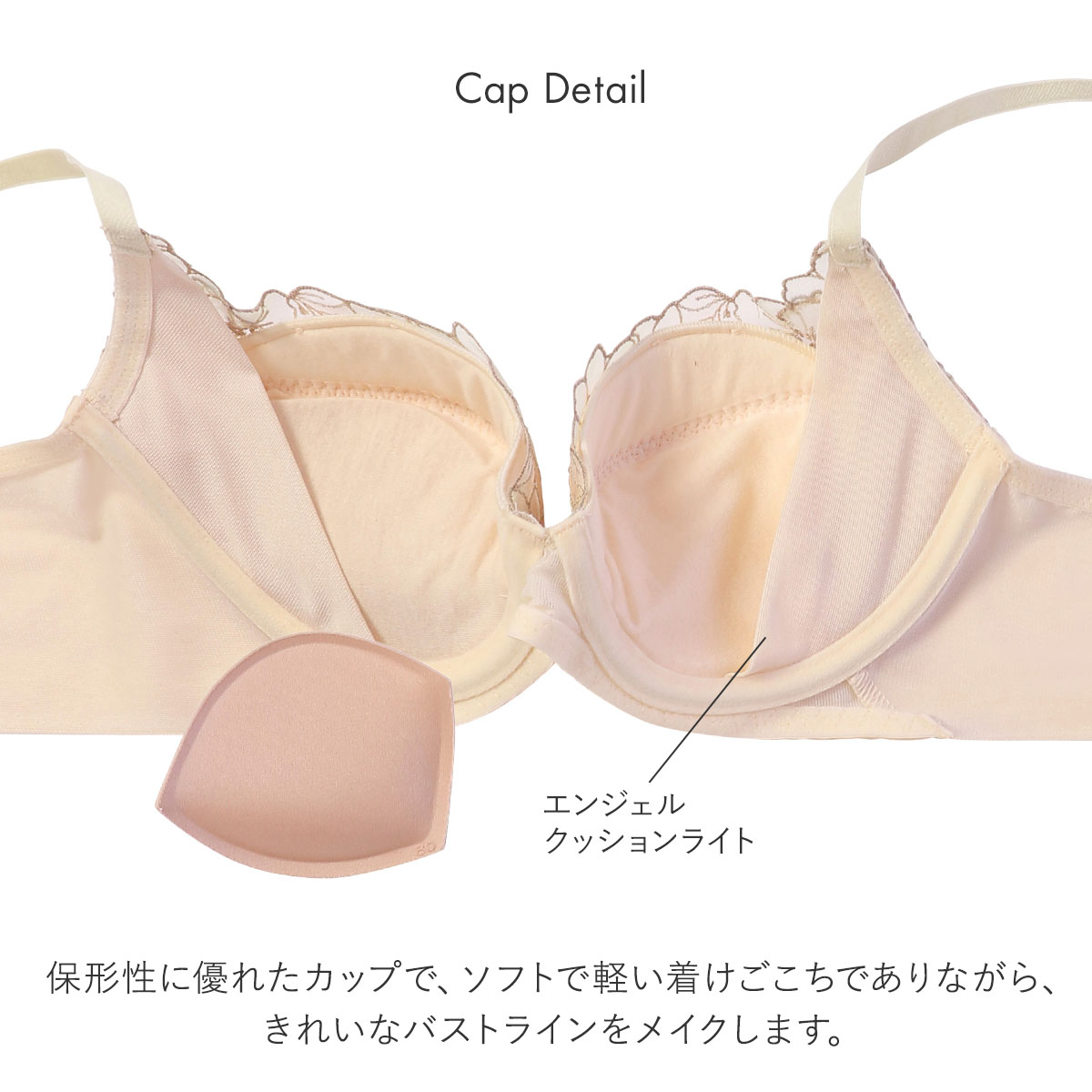 保形性に優れたカップ素材、「エンジェルクッション(R)ライト」を使用。ソフトで軽い着けごこちでありながら、きれいなバストラインをメイクします。パッドポケットは綿混素材を使用。背部はマイクロファイバー使いのヘム仕様で、アウターにひびきにくくなっています。