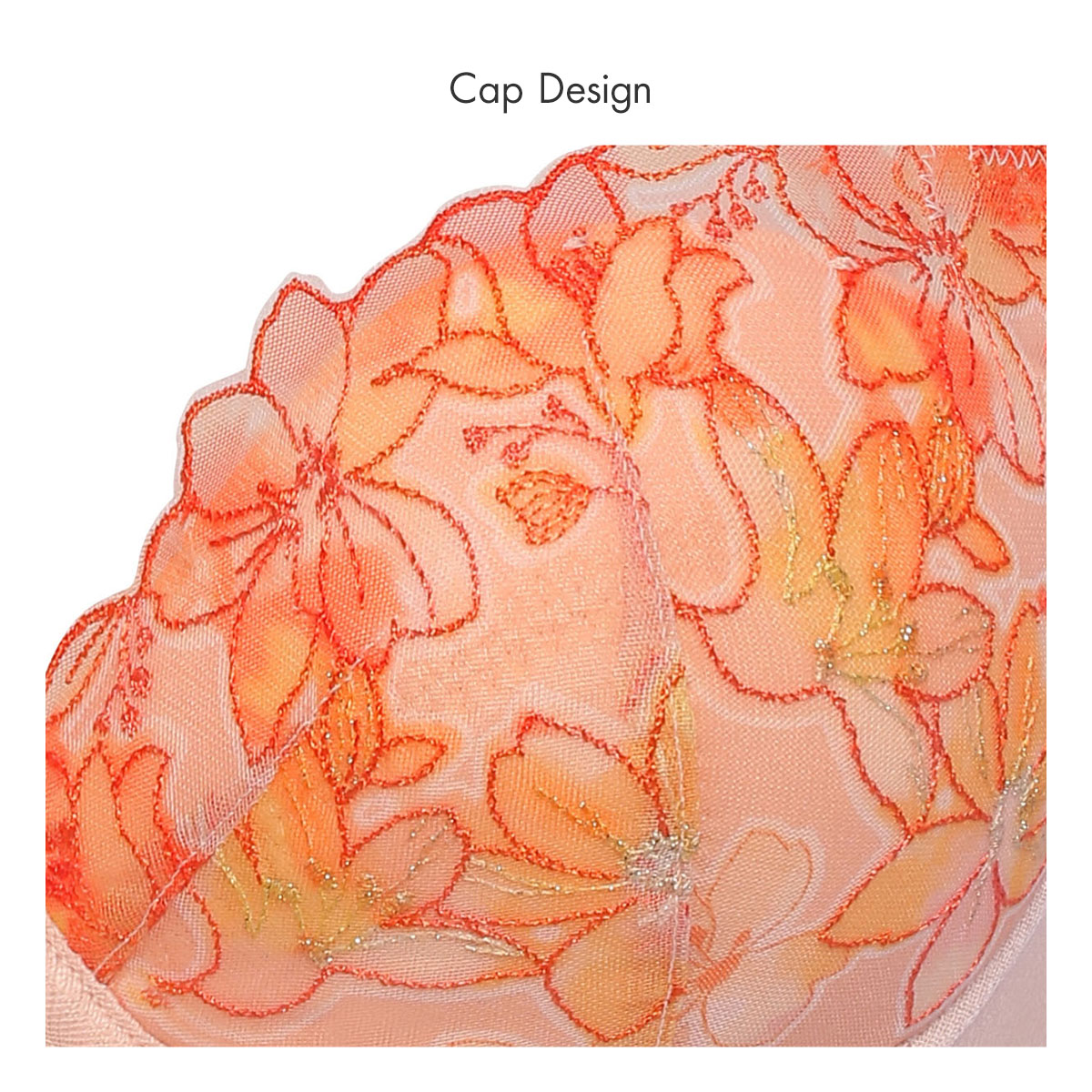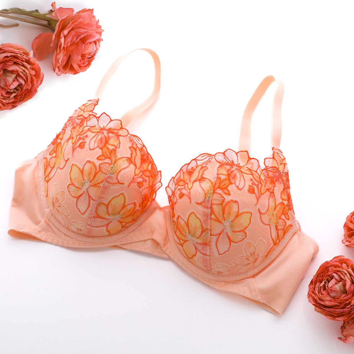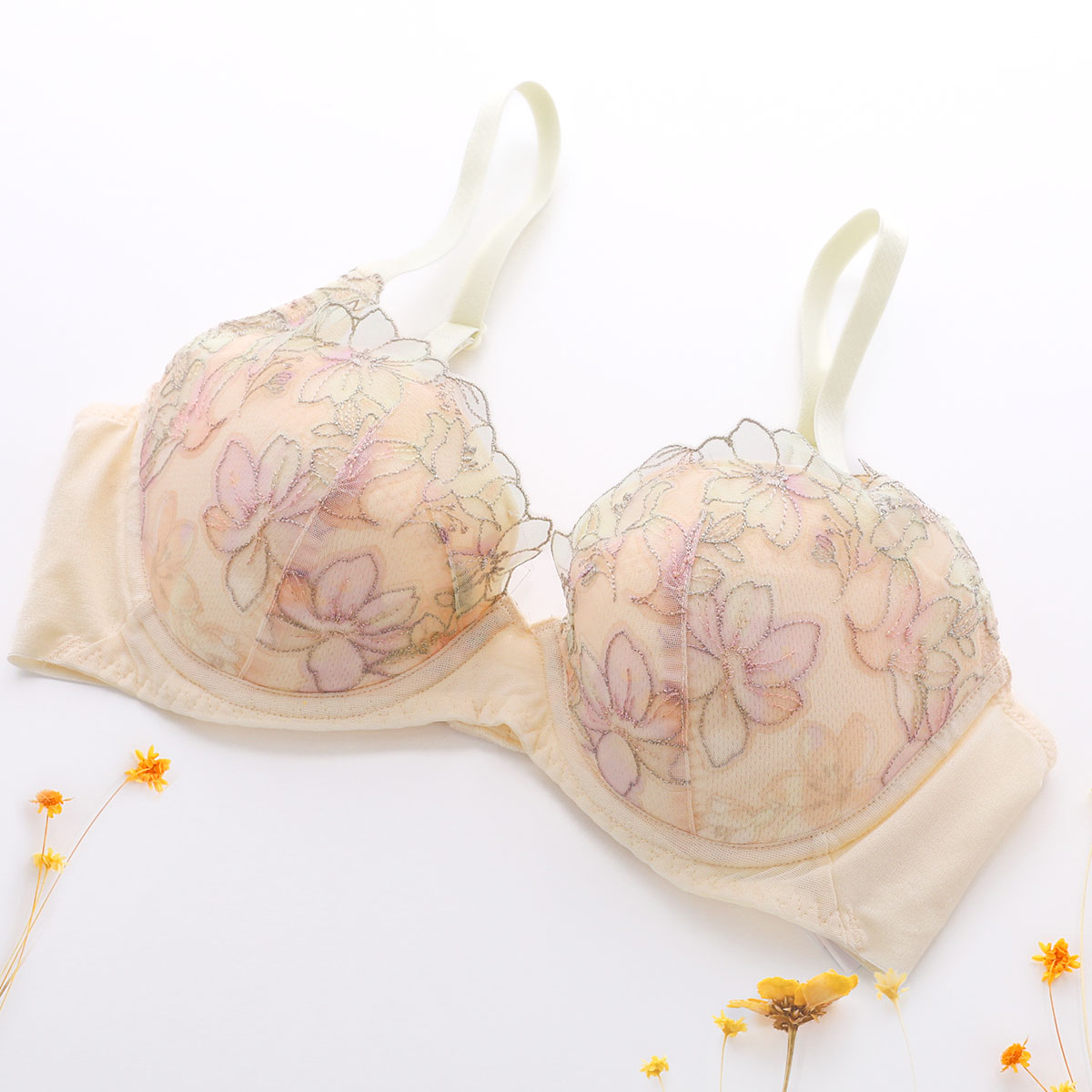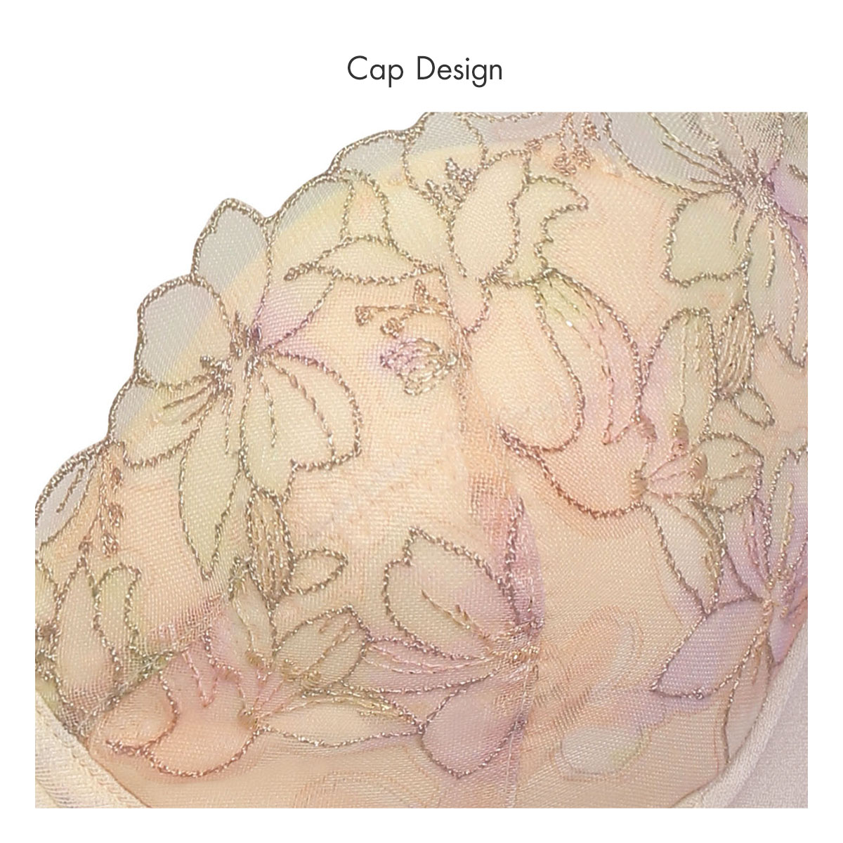 春の到来、花々の開花、色、香りといった魔法のような季節の良いバイブレーションを捉えて桜をイメージしたエンブロイダリーレースを使用した、天使のブラ魔法のハリ感TR596シリーズ。レースにはグラデーションプリントを施して、華やかさと軽やかさのあるビジュアルに仕上げています。