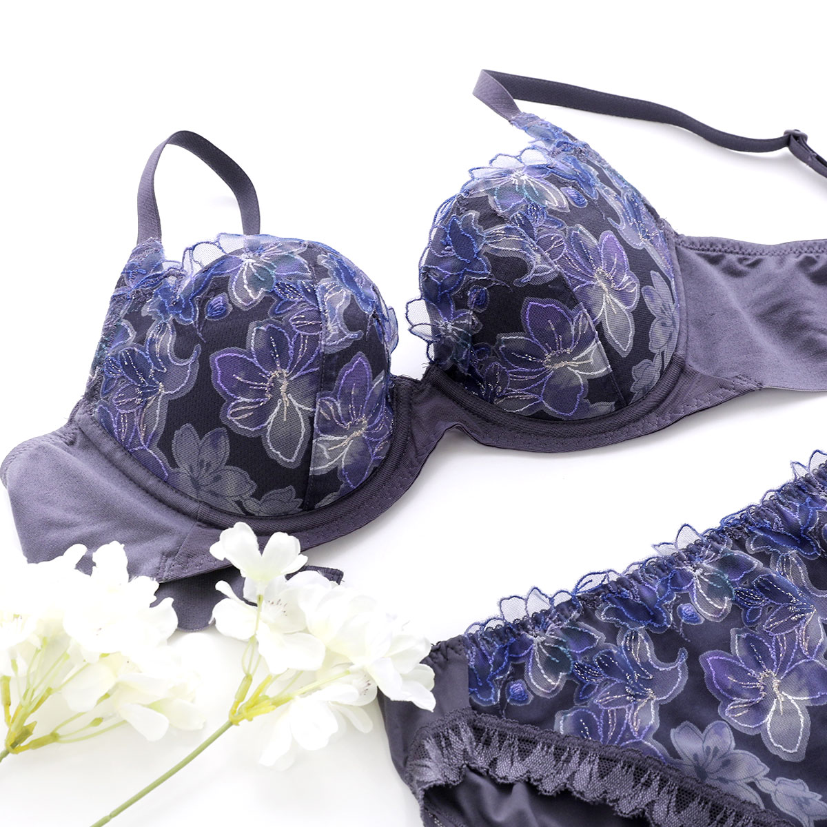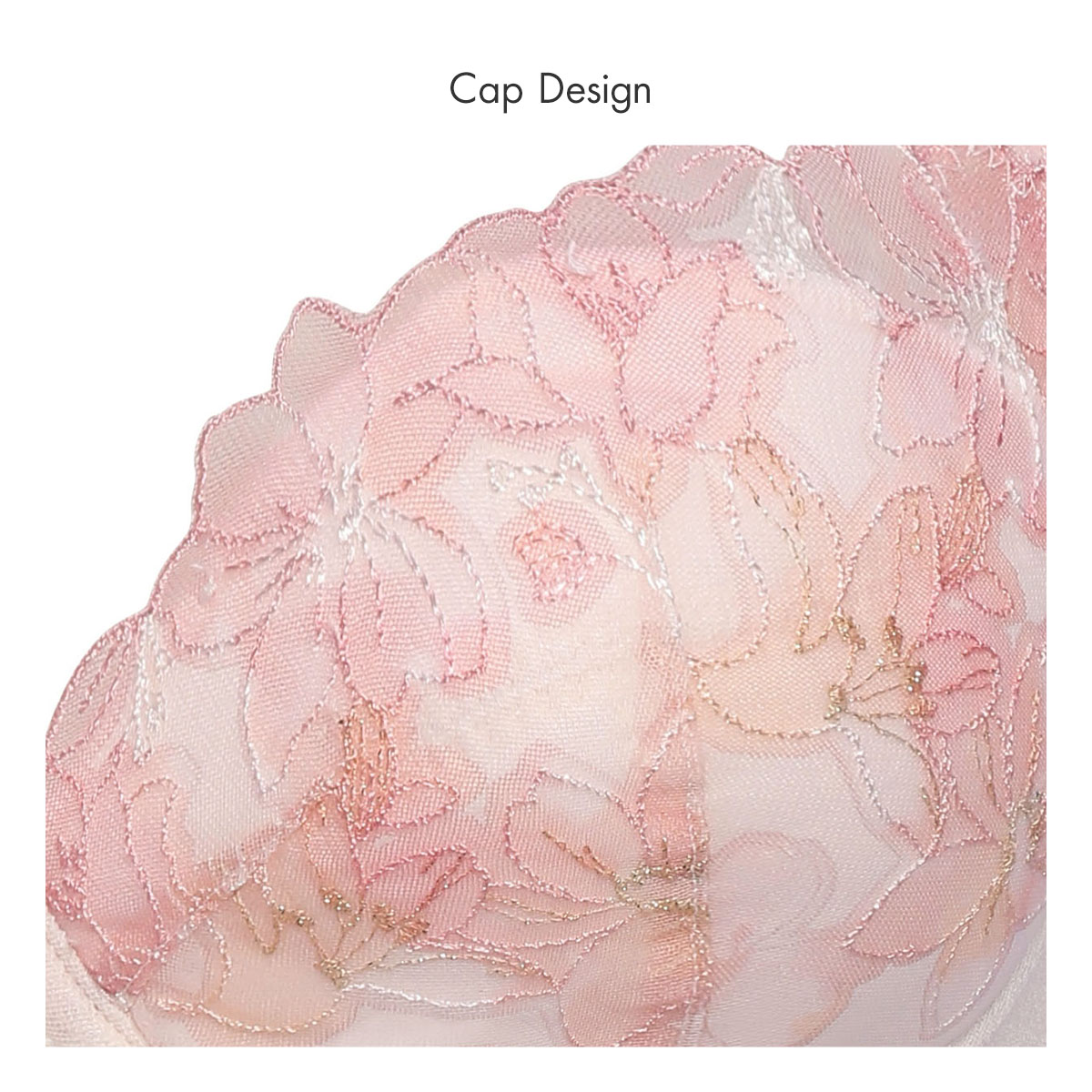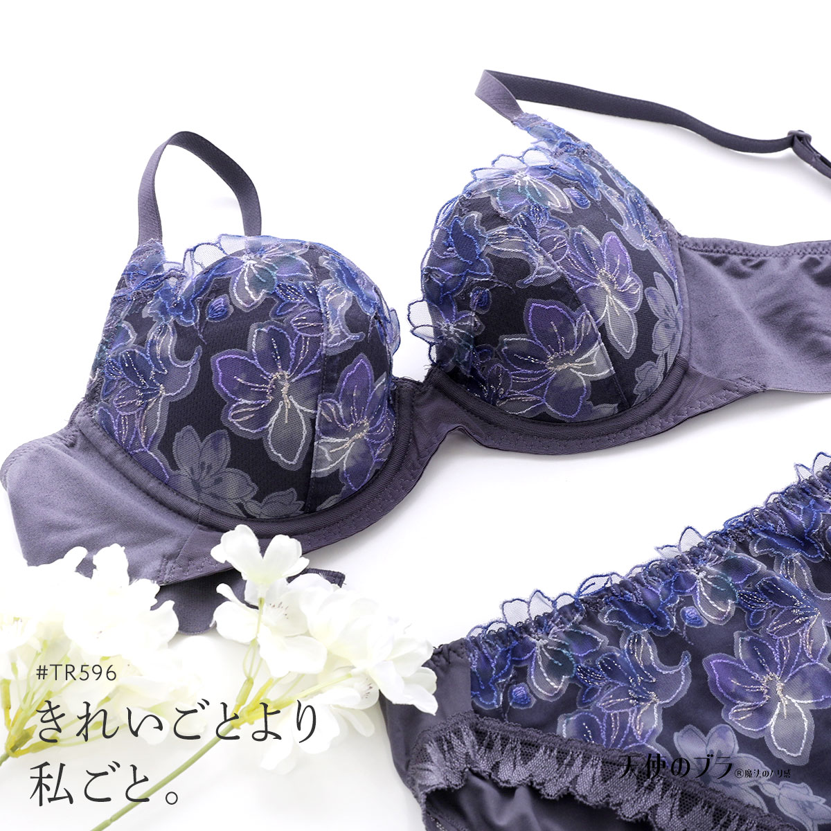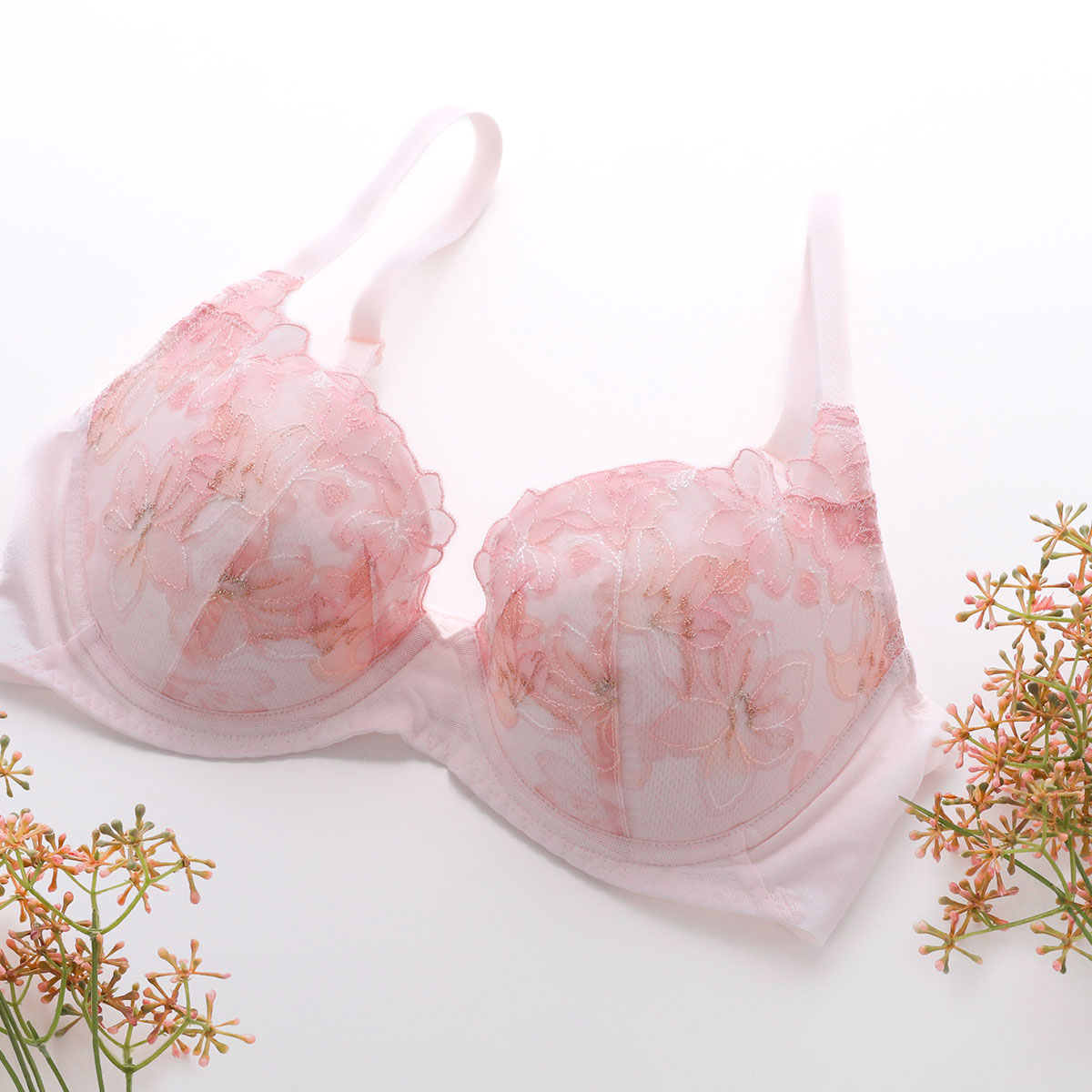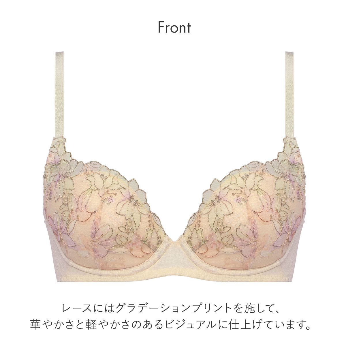 春の到来、花々の開花、色、香りといった魔法のような季節の良いバイブレーションを捉えて桜をイメージしたエンブロイダリーレースを使用した、天使のブラ魔法のハリ感TR596シリーズ。レースにはグラデーションプリントを施して、華やかさと軽やかさのあるビジュアルに仕上げています。