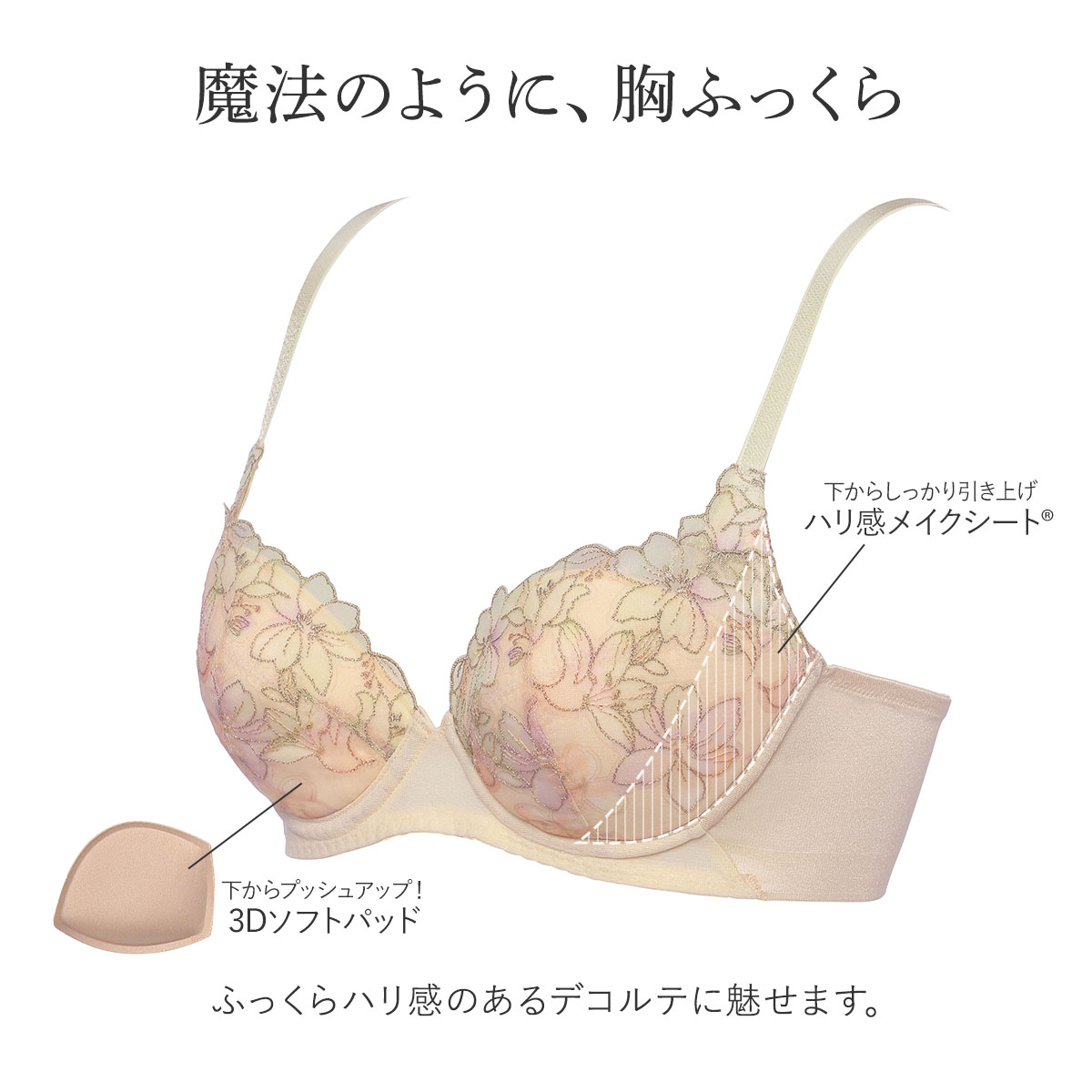 カップサイドの「ハリ感メイクシート(R)」で、バストを下からしっかり引き上げ、内側に寄せるので、ふっくらハリ感のあるデコルテに魅せます。3Dソフトパッドでバストを下からしっかりプッシュアップします。