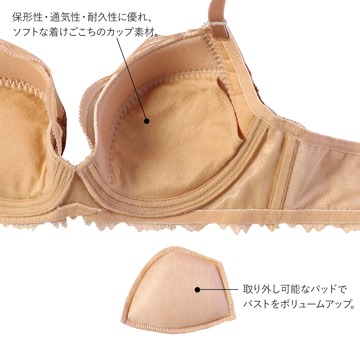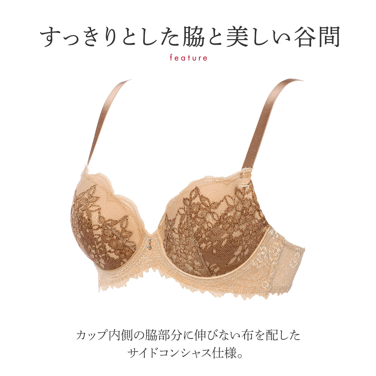 カップ内側の脇部分に伸びない布を配したサイドコンシャス(R)仕様で、すっきりとした脇と美しい谷間を実現します。保形性・通気性・耐久性に優れ、ソフトな着けごこちのカップ素材、「エンジェルクッション(R)ライト」を使用しています。
