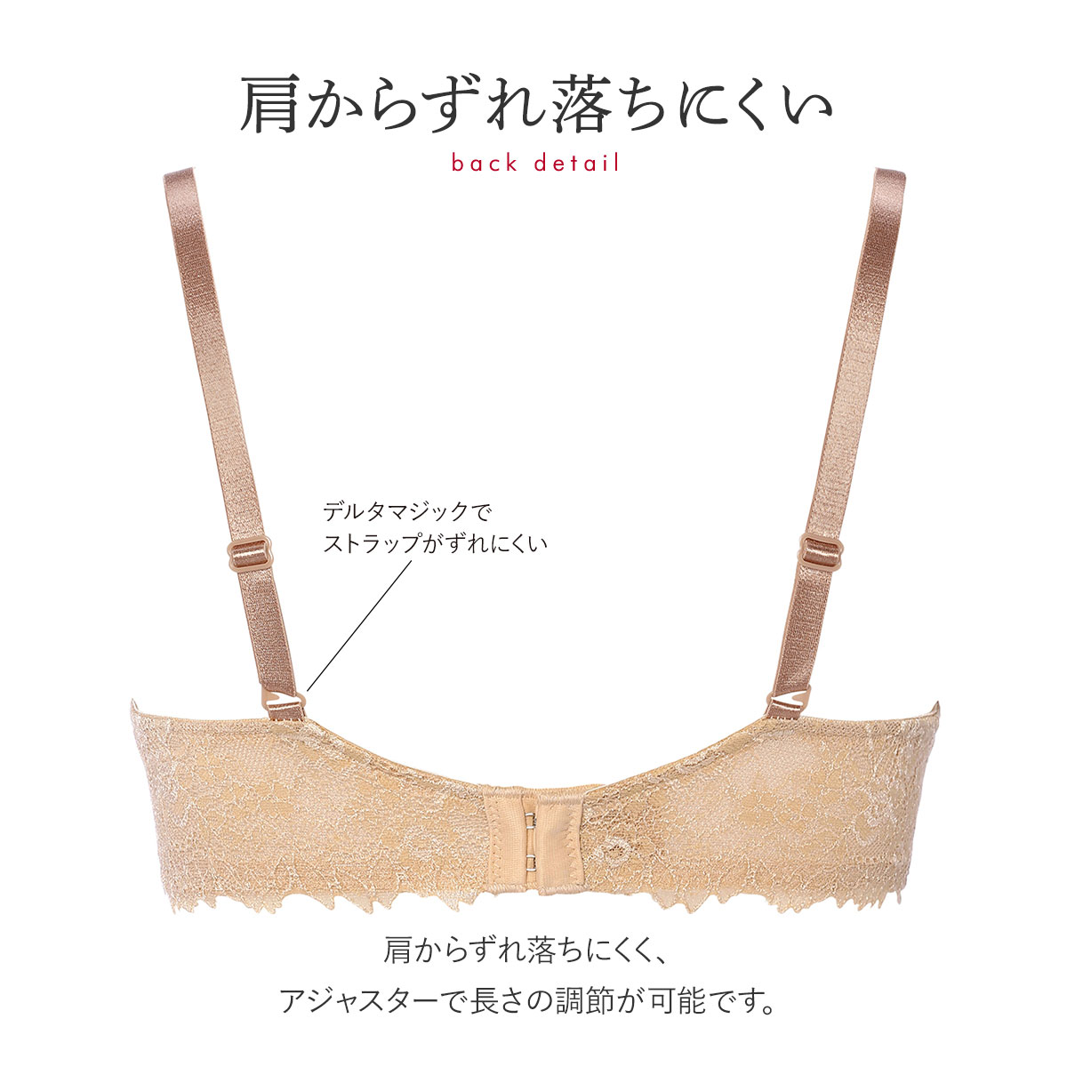 ワイヤーをカップの外側に縫いこんだアウトサイドワイヤー(R)仕様で、やさしい肌当たりです。前中心部のワイヤーを薄くフラットにし外側に反らせた「NEWエンジェルワイヤー(R)」仕様のため、肌にくいこみにくく痛くなりにくくなっています。
