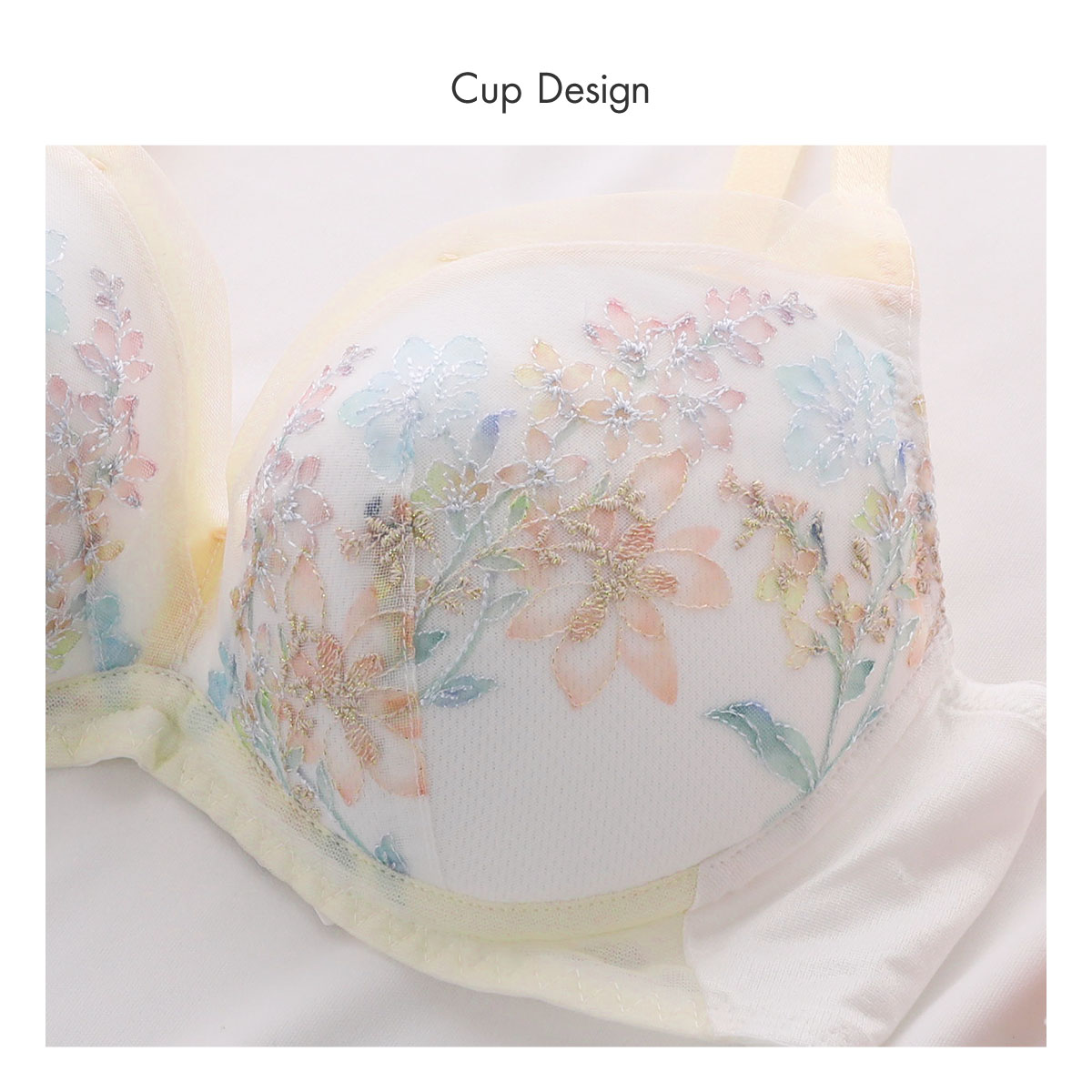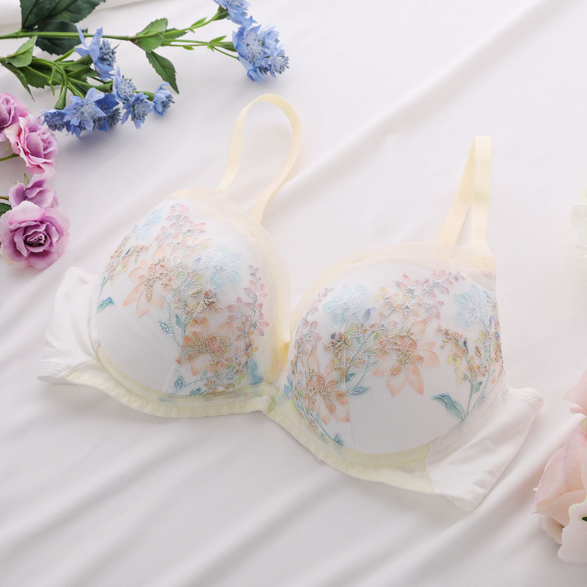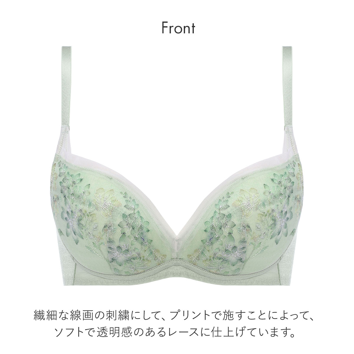 春の到来、花々の開花、色、香りといった魔法のような季節の良いバイブレーションを捉えて、ストックのブーケをイメージしたエンブロイダリーレースが印象的な、天使のブラ魔法のハリ感TR597シリーズ。繊細な線画の刺繍にして、カラーを刺繍ではなく、プリントで施すことによって、ソフトで透明感のあるレースに仕上げています。