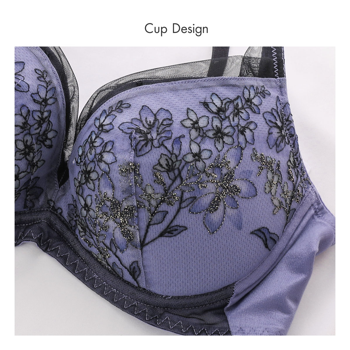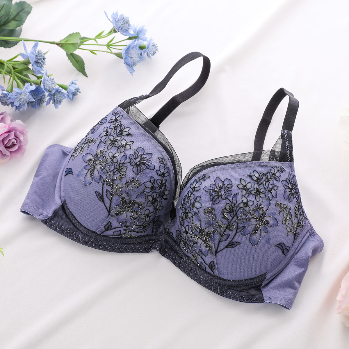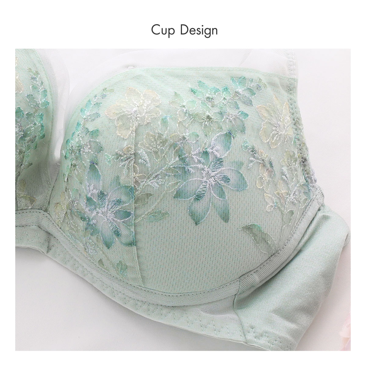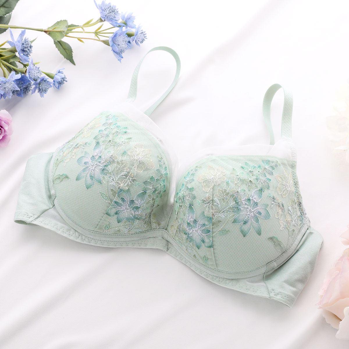 春の到来、花々の開花、色、香りといった魔法のような季節の良いバイブレーションを捉えて、ストックのブーケをイメージしたエンブロイダリーレースが印象的な、天使のブラ魔法のハリ感TR597シリーズ。繊細な線画の刺繍にして、カラーを刺繍ではなく、プリントで施すことによって、ソフトで透明感のあるレースに仕上げています。