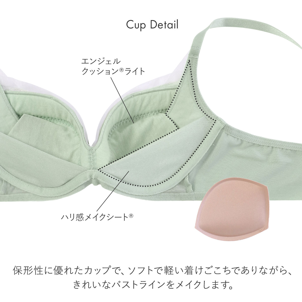 カップ内側のメッシュで、立体的なバストシルエットを作ります。保形性に優れたカップ素材、「エンジェルクッション(R)ライト」を使用。ソフトで軽い着けごこちでありながら、きれいなバストラインをメイクします。