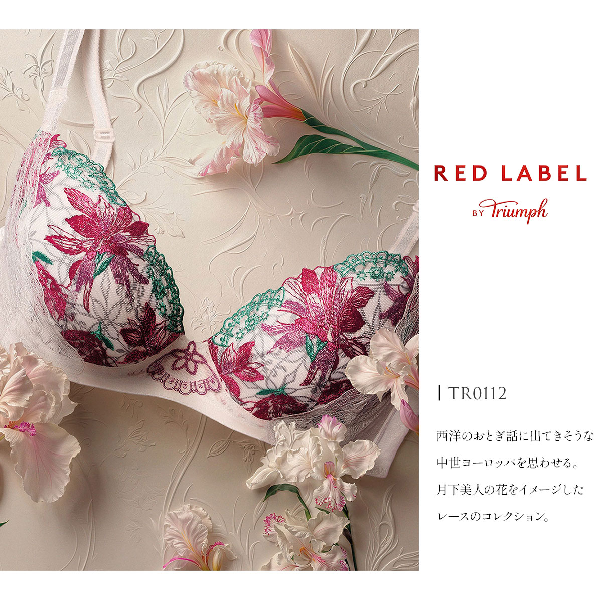 天使のブラスリムラインTR0112シリーズは、月下美人の花をイメージしたレースのデザイン。西洋のおとぎ話に出てきそうな、中世ヨーロッパを思わせる幾何的な模様のプリントを組み合わせたレースをメインに使用しています。大胆で華やかなエンブレースと、控えめな輝きの繊細な編みレースのコンビネーションが美しいシリーズです。