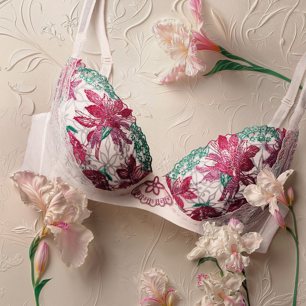 フロント中心部のワイヤーを薄くフラットにし外側に反らせた“NEWエンジェルワイヤー”を使用。肌にくいこみにくく痛くなりにくくなっています。ストラップとめ具に三角形の特殊な形をした“デルタマジック”を使用しているので、肩からずれ落ちにくくなっています。