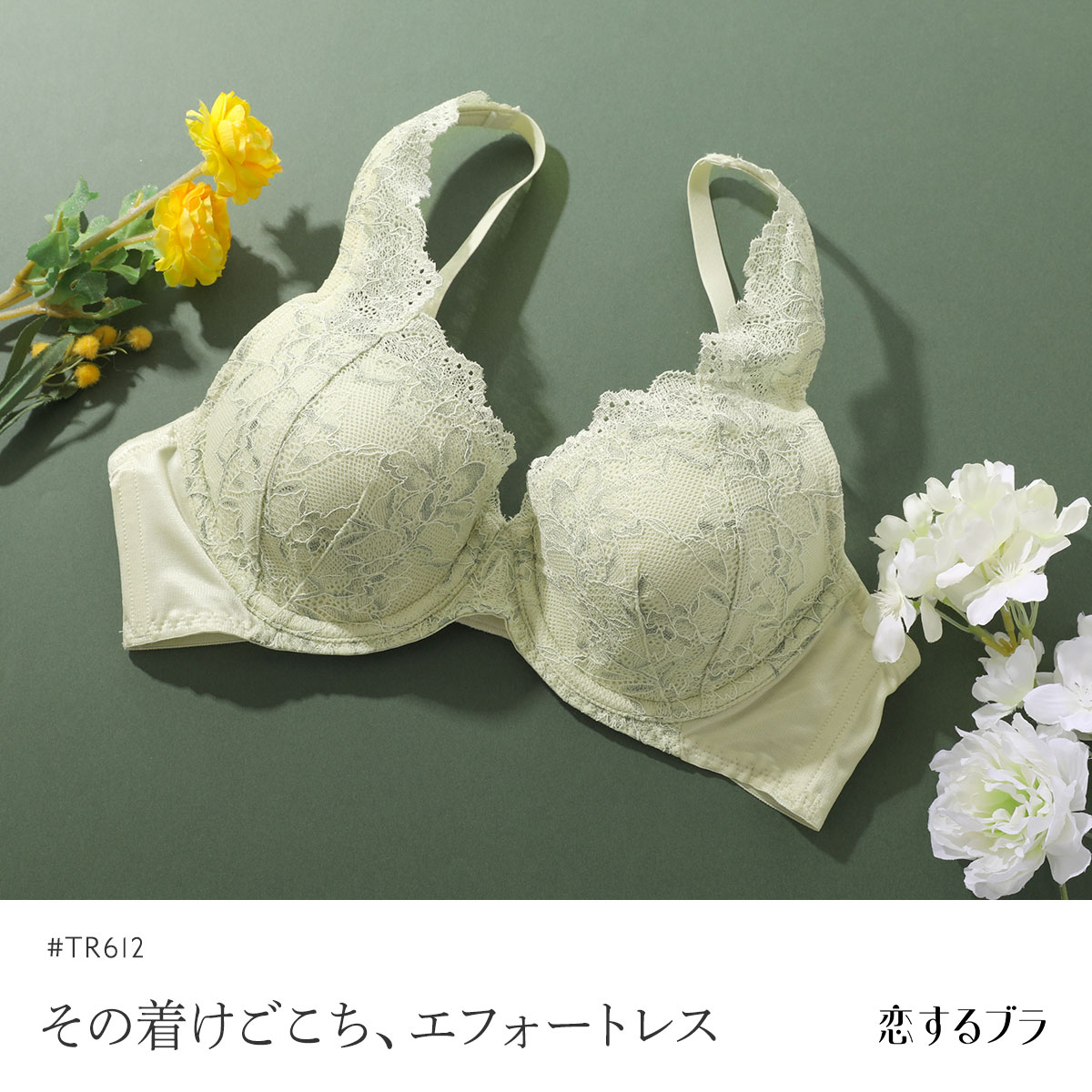 恋するブラTR612恋するブラTR612は風にそよぐリンドウの花や葉っぱをイメージして、穏やかなボタニカル柄をコード糸を使って描いた、線画調のレースを使用した優しい雰囲気。