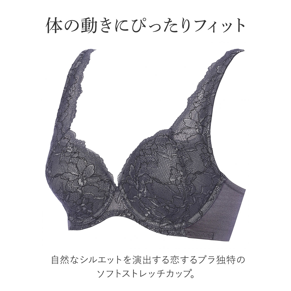 体の動きにぴったりフィットし、自然なシルエットを演出する恋するブラ独特のソフトストレッチカップ。カップ下部にホールがあるので、通気性がよいです。カップ裏は綿混素材です。軽くて通気性の良いファイバーフィルパッドで、ナチュラルにボリュームアップ!