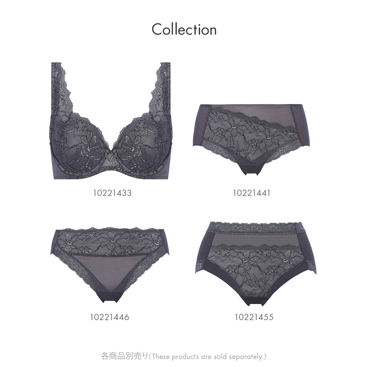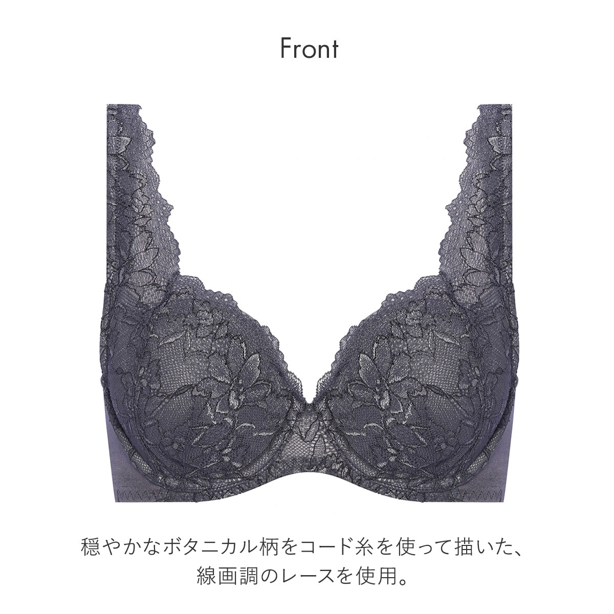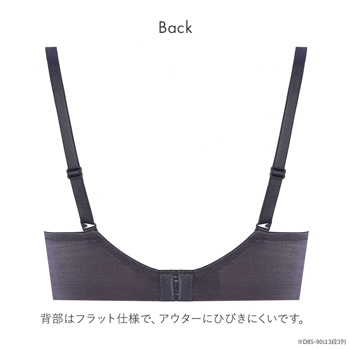 フロント中心部のワイヤーを薄くフラットにし、外側に反らせた「NEWエンジェルワイヤー」を使用。肌にくいこみにくく、痛くなりにくくなっています。背部はリサイクルナイロン糸を使った生地のフラットな仕様なので、アウターにひびきにくくなっています。ストラップは伸縮性に富む生地と背部から続くテープで、肩にフィットしてよく伸びる「肩楽ストラップ」。ストラップのとめ具に三角形の特殊な形をした「デルタマジック」を使用しているので、肩からずれ落ちにくくなっています。ストラップにアジャスターがついているので長さの調節が可能です。