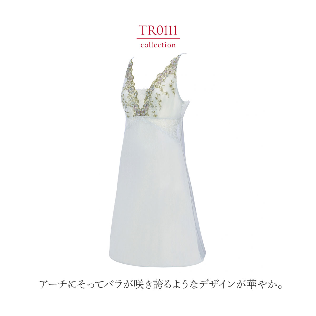トリンプ プレミアムデザインレッドレーベル TR0111 眠り姫からインスピレーションを受けたシリーズ。アーチにそってバラが咲き誇るようなデザインが華やか。アップリケに施したラメ糸が夜明けの露のように光り輝きます。